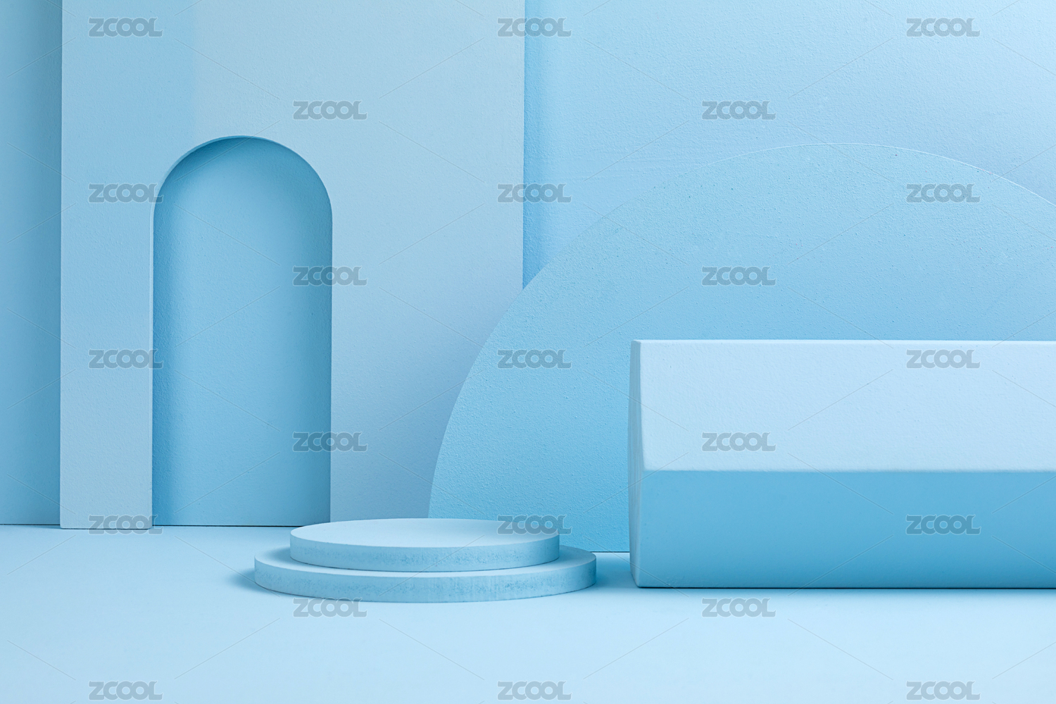 藍(lán)色背景中,幾何體和拱門搭建的3D展臺(tái)