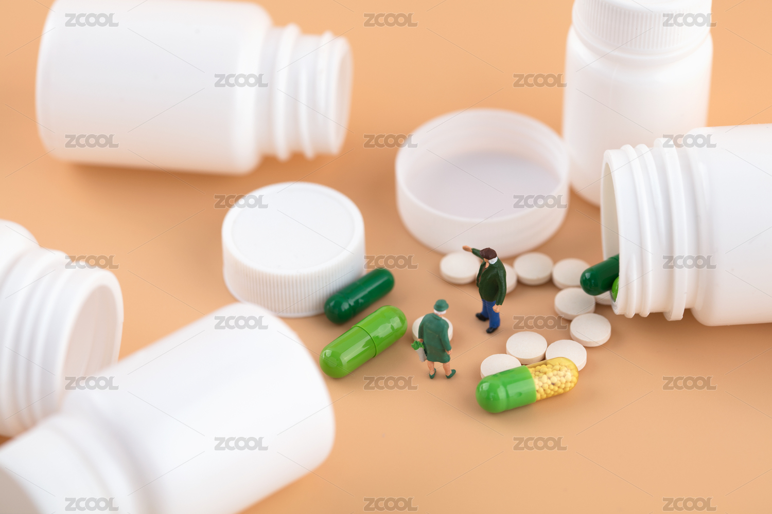 沙盤小人微距攝影膠囊藥瓶與硬幣堆疊代表西藥藥價(jià)醫(yī)保報(bào)銷概念
