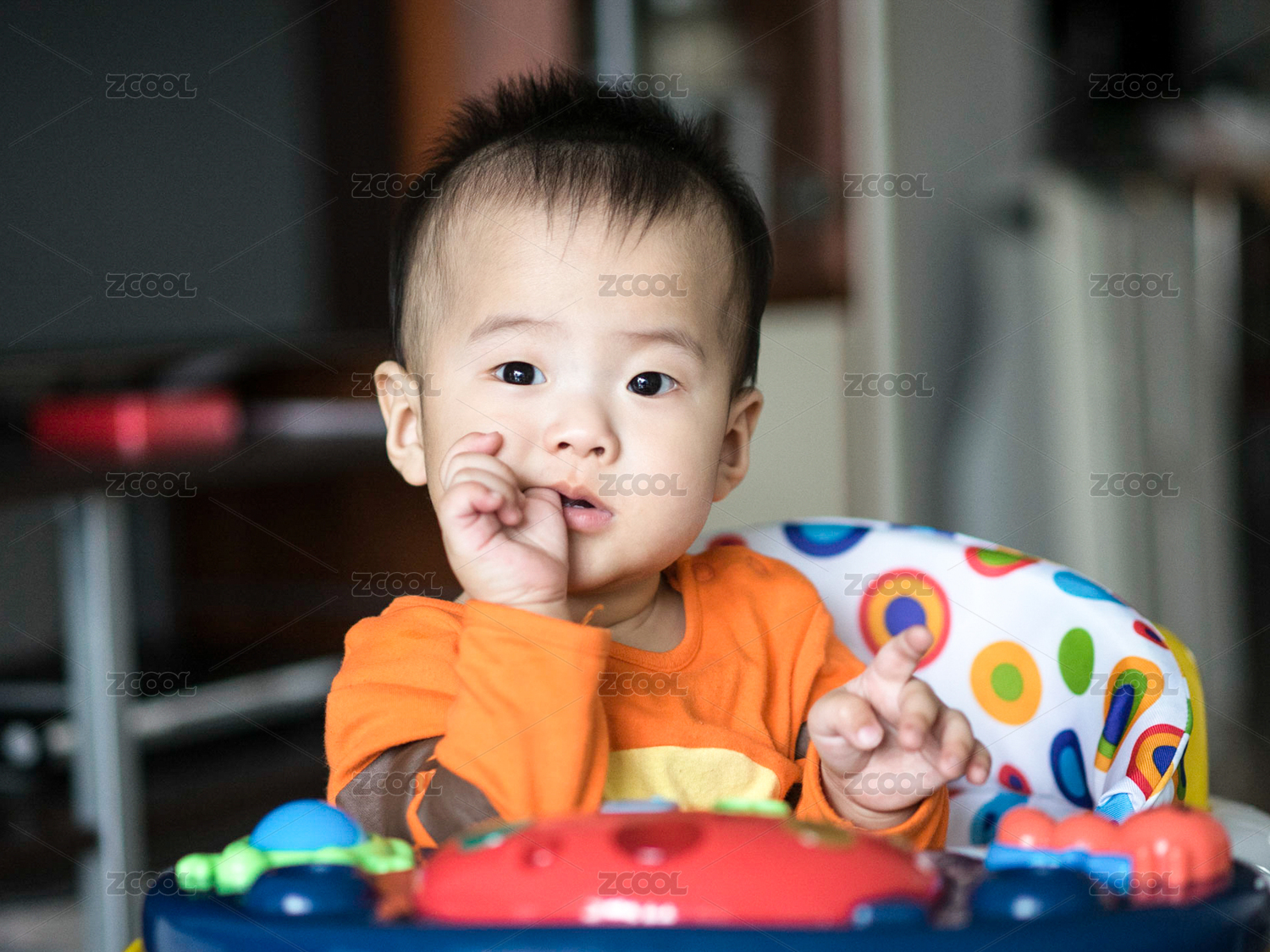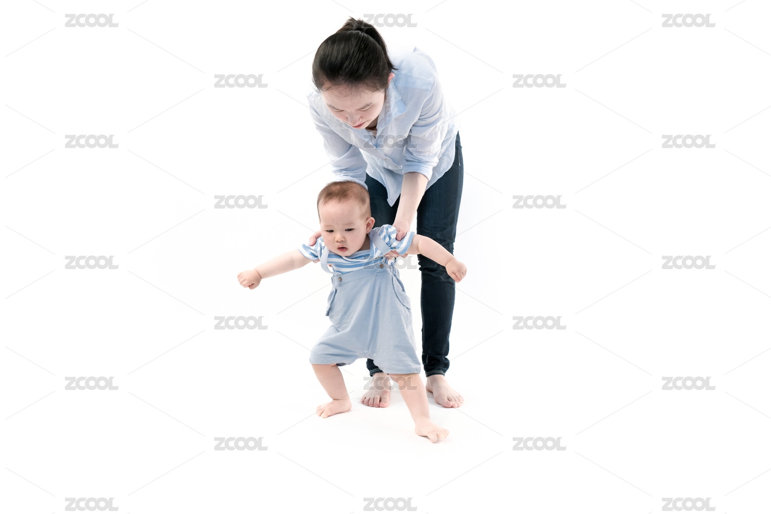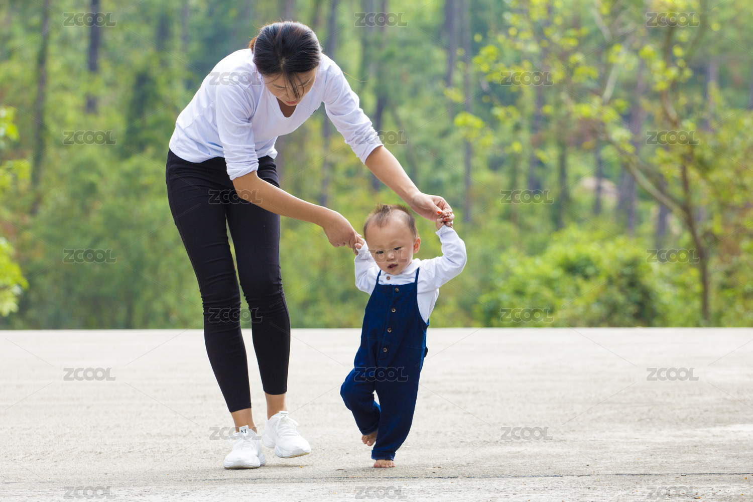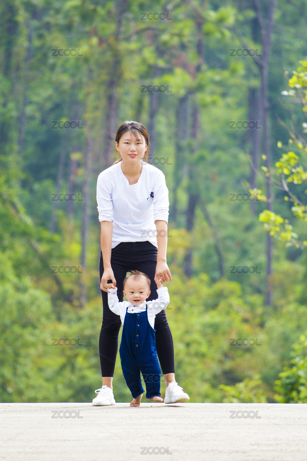 在草坪上媽媽攙扶穿水兵服的男嬰學步