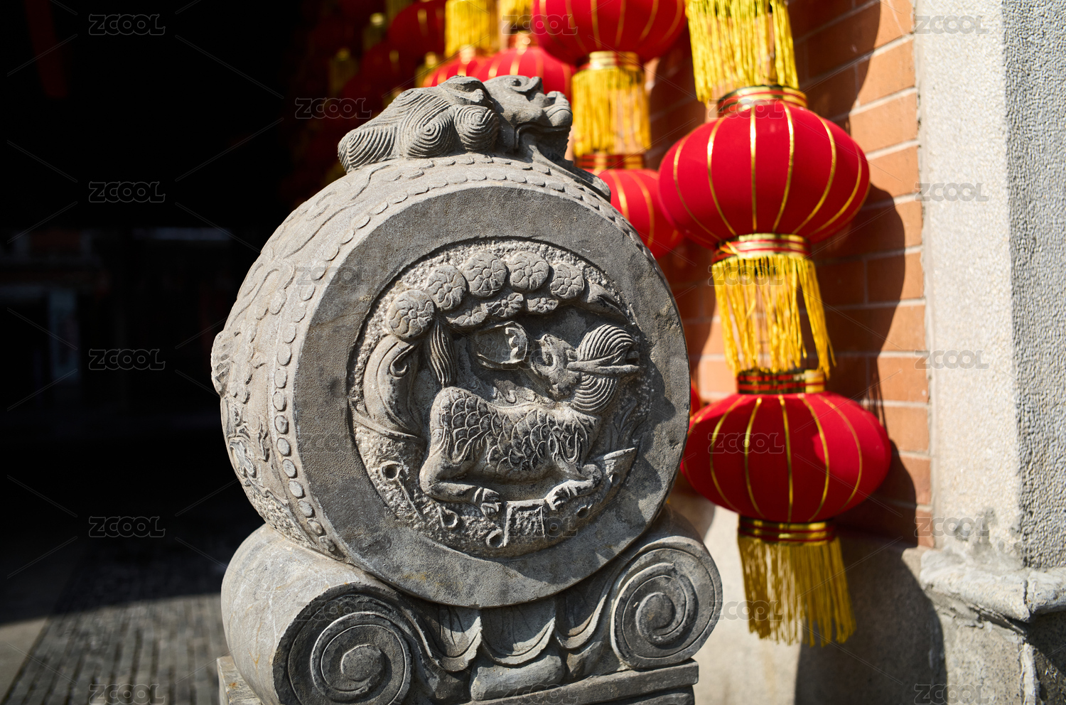 獸首抱鼓石鼓形門當(dāng)和紅燈籠