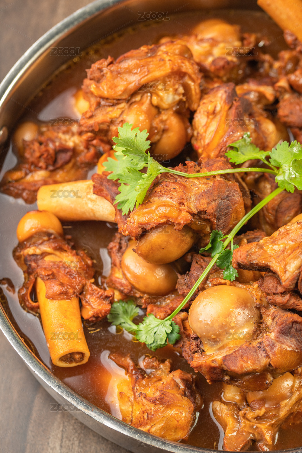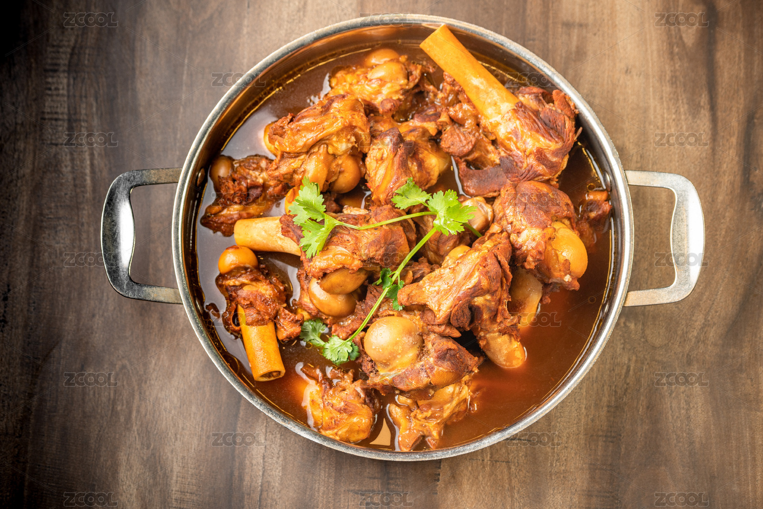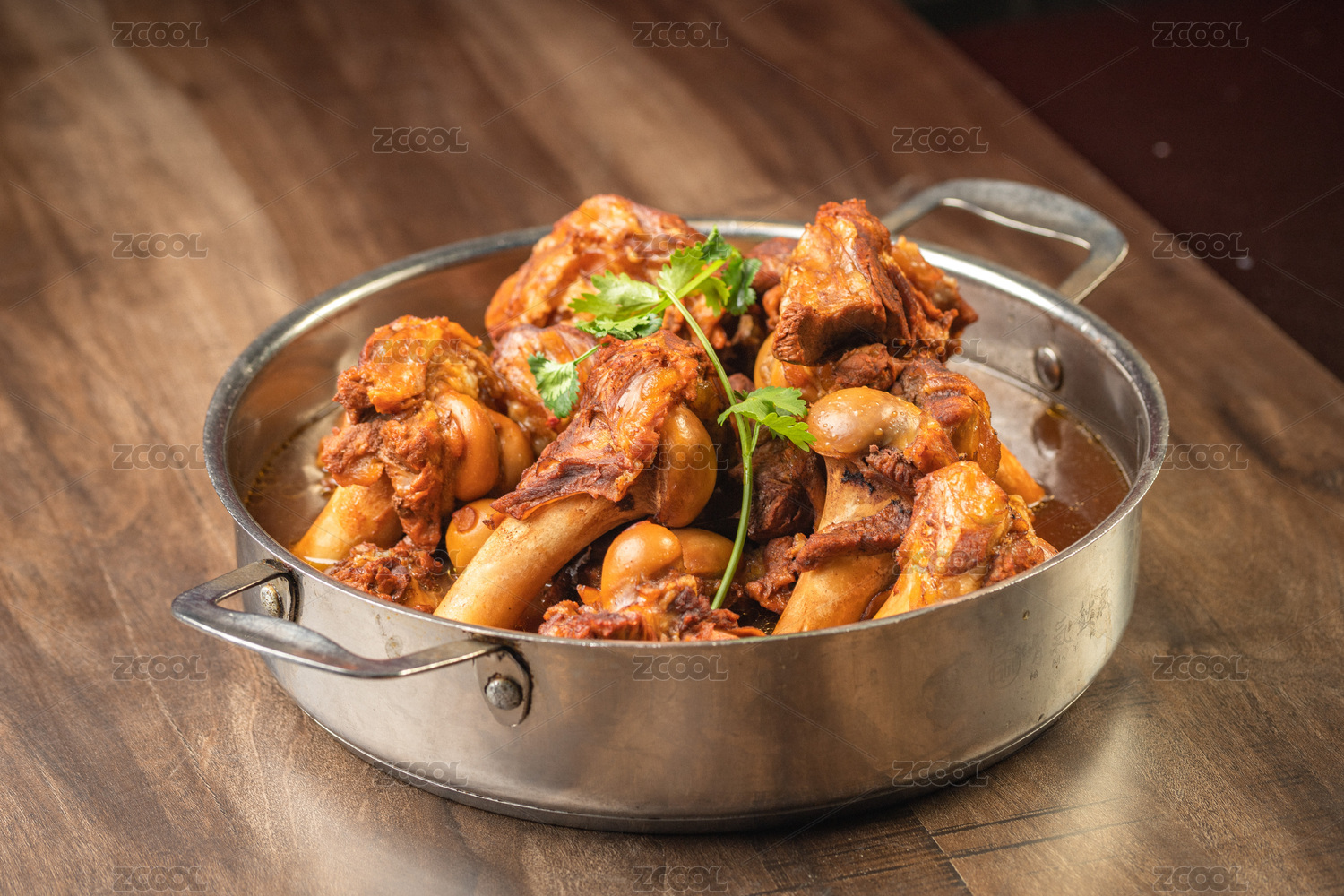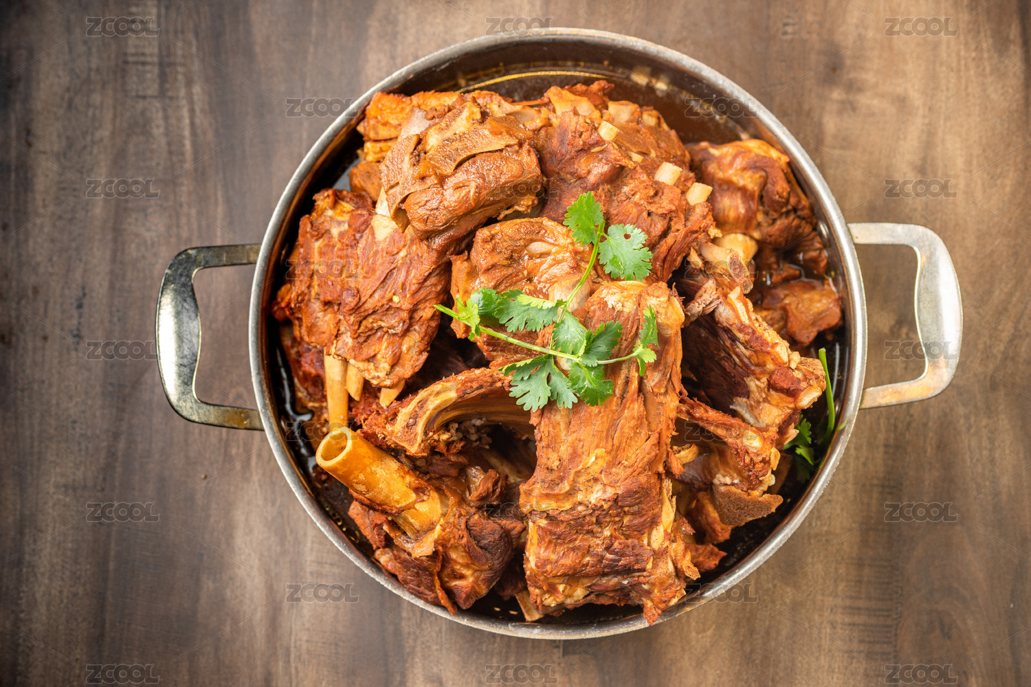 棕色木紋桌面上有一份燉羊棒骨