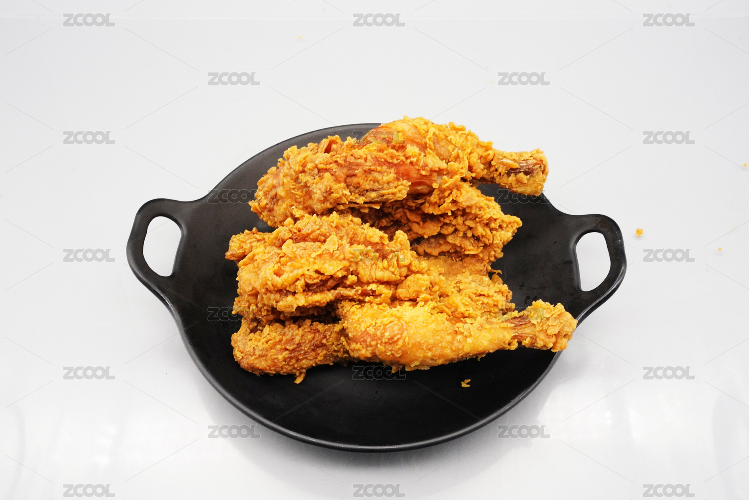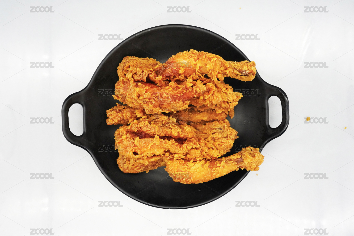 桌子上黑雙耳鍋里的一只炸雞