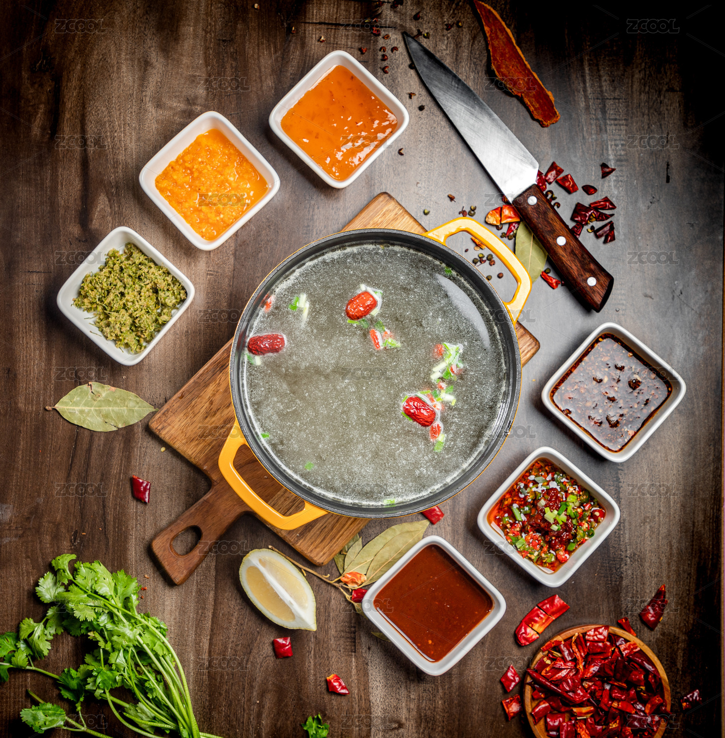 桌上有一鍋清湯鍋底和小料