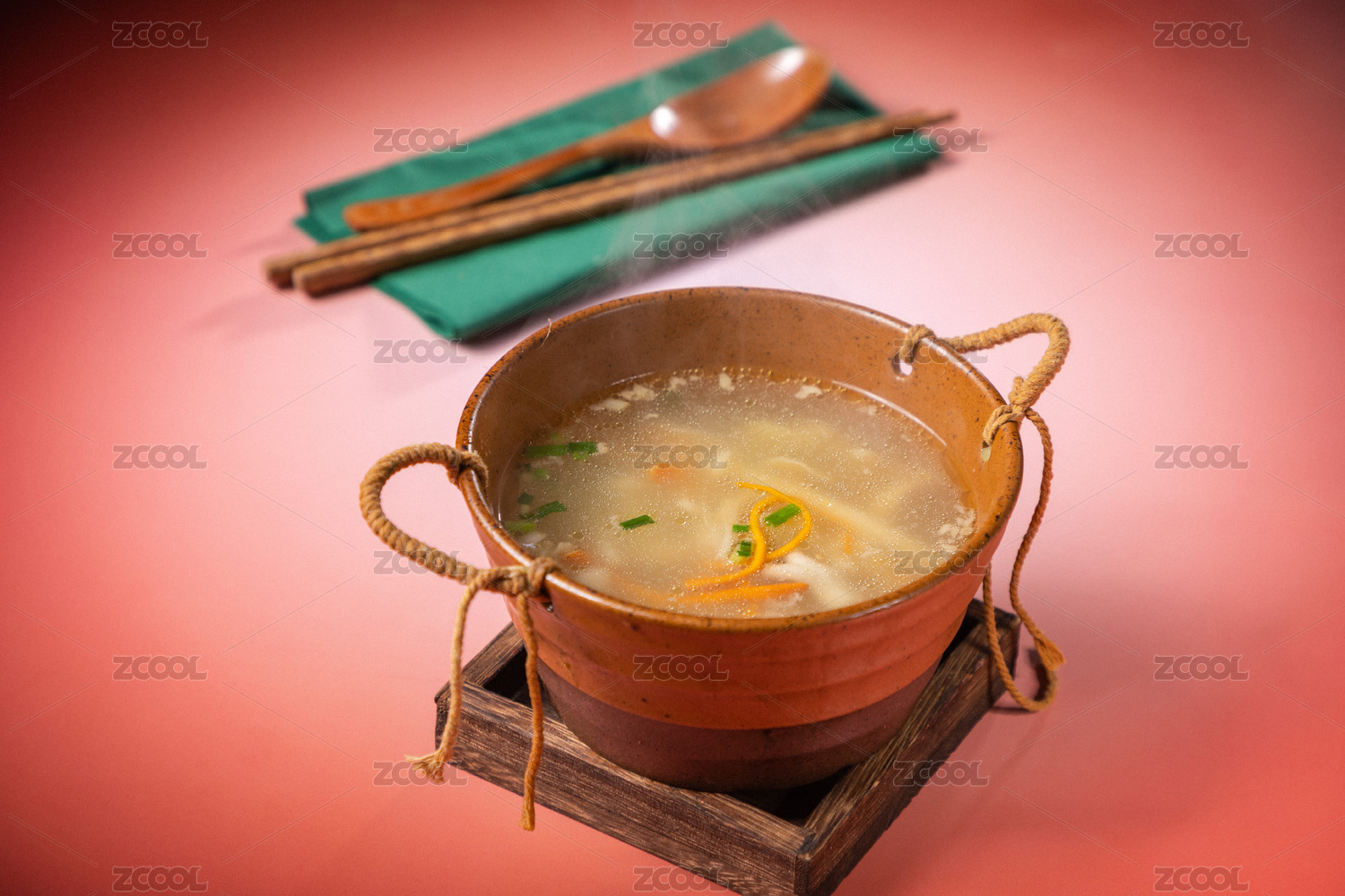 紅色桌面上有一份雞湯米線