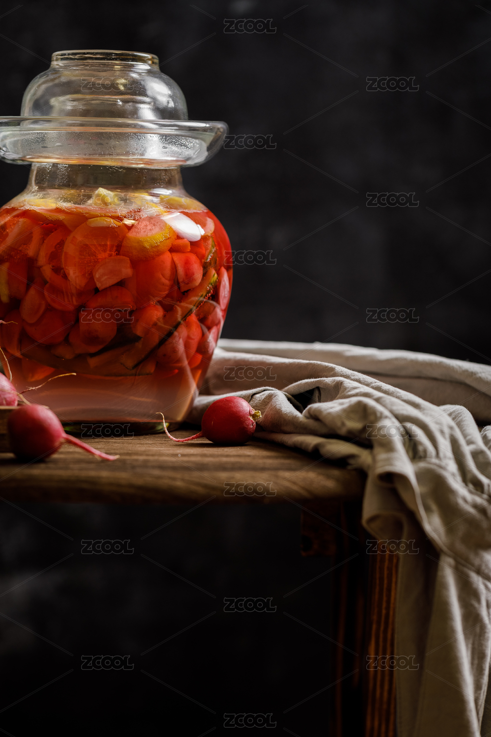 放在木桌上的一壇子泡菜和櫻桃蘿卜