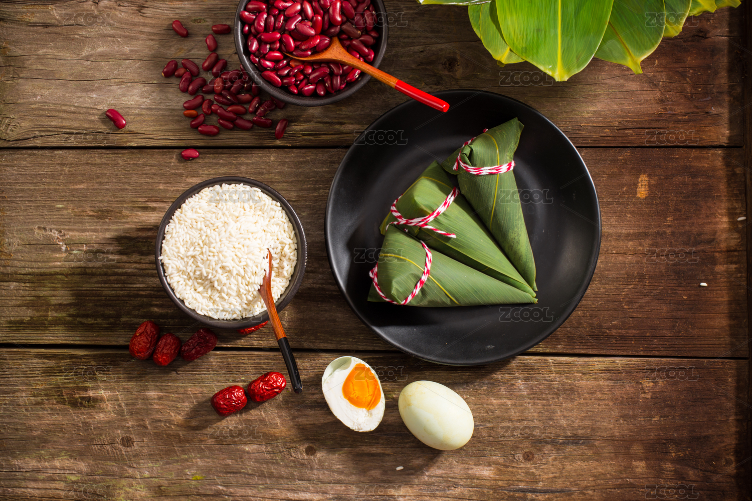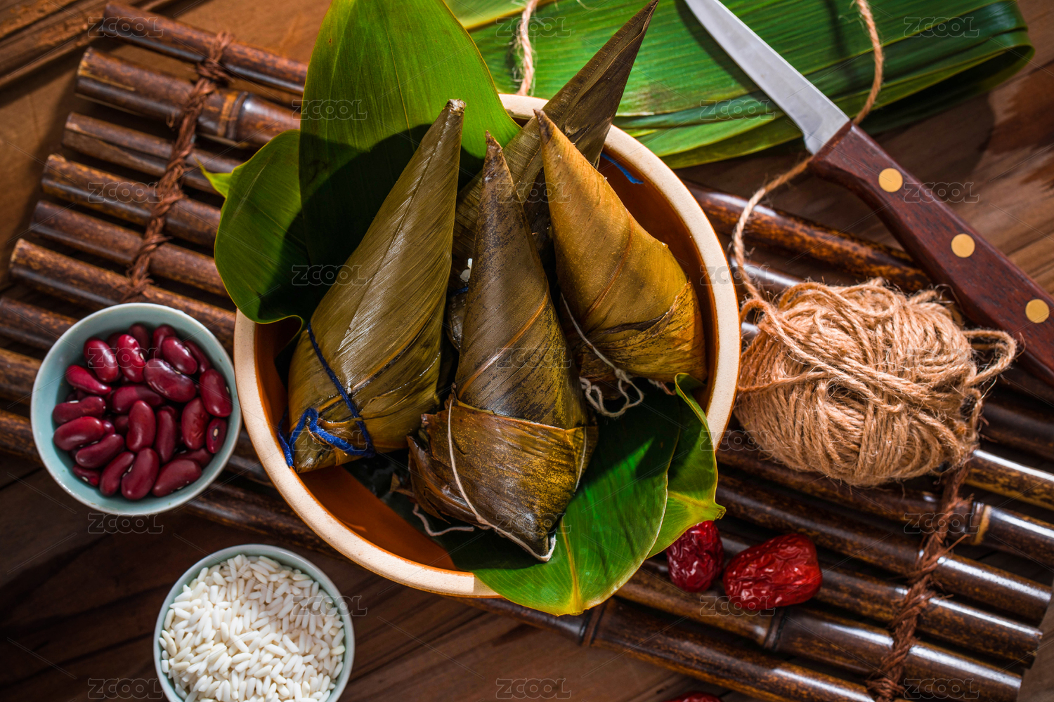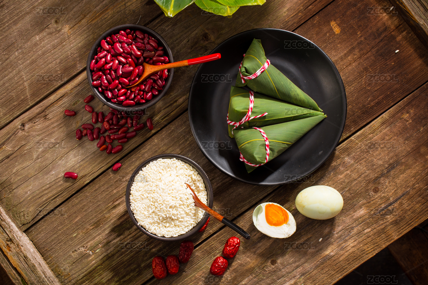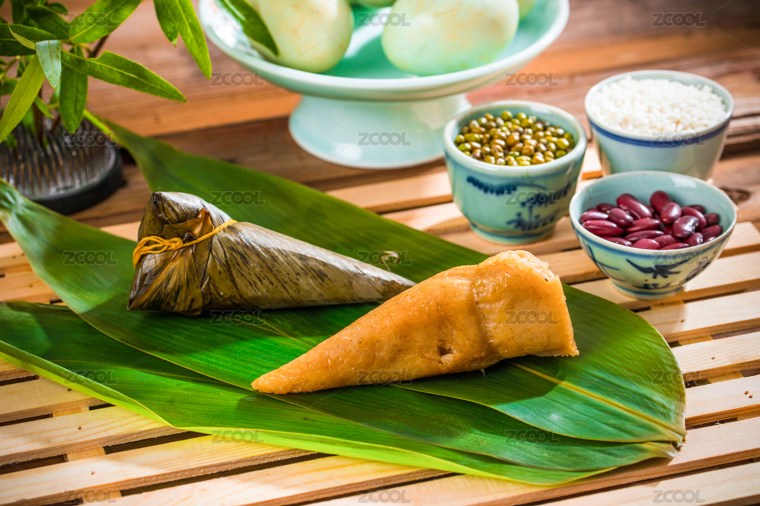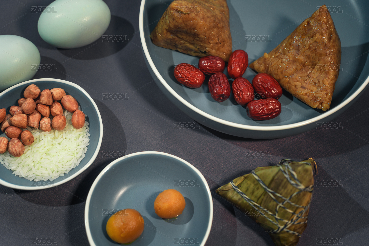 五個立著放著復(fù)古盤里的尖角粽子,旁邊擺放著粽子食材