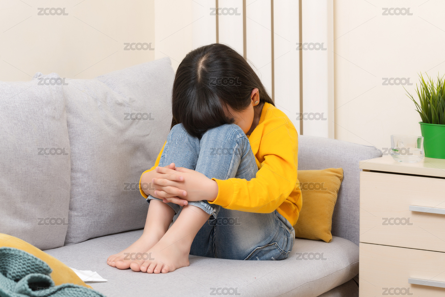 蜷縮在沙發(fā)上傷心哭泣的亞洲小女孩