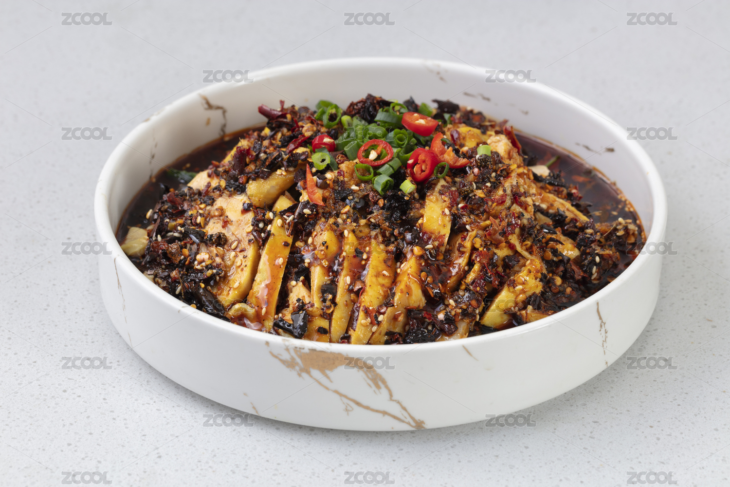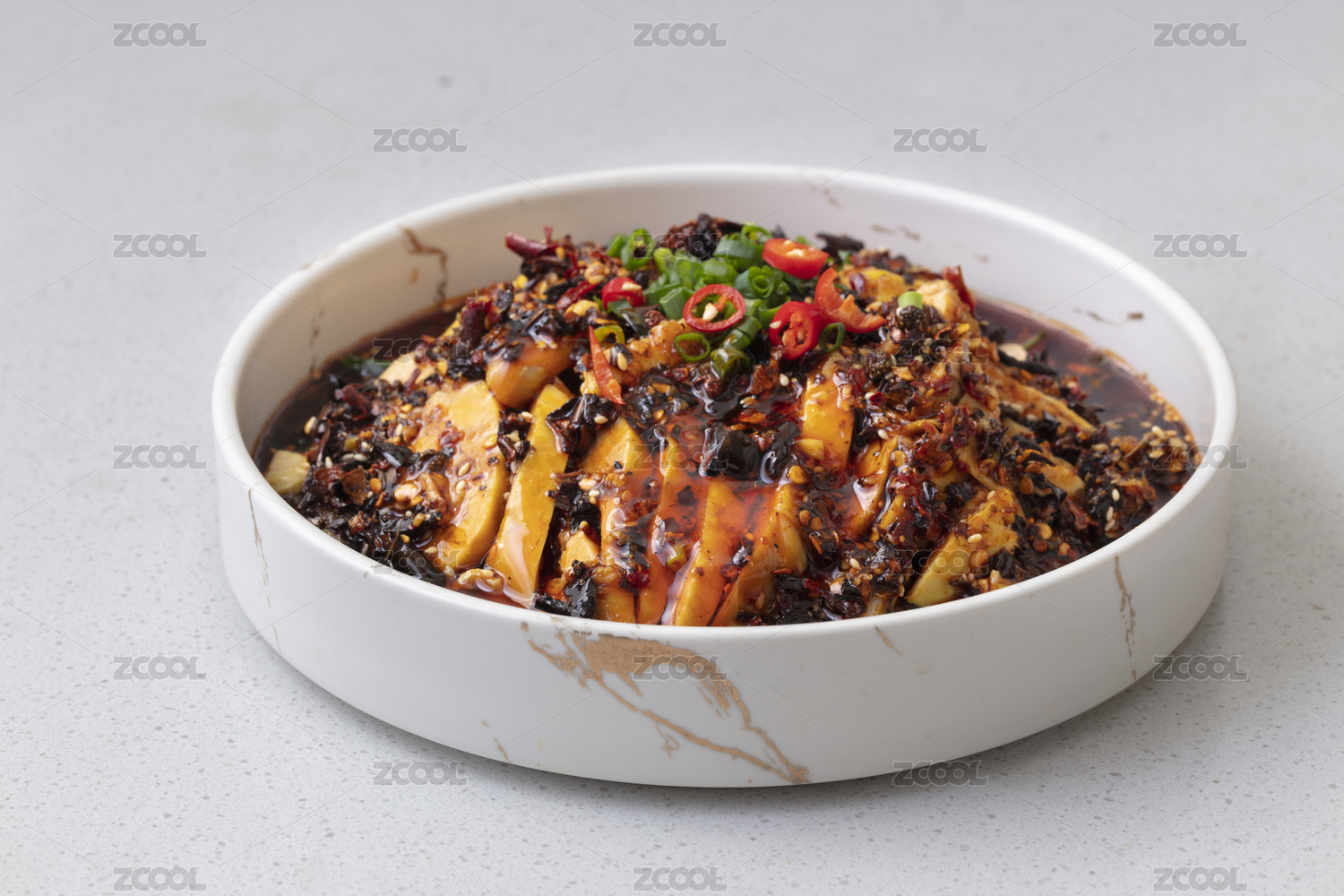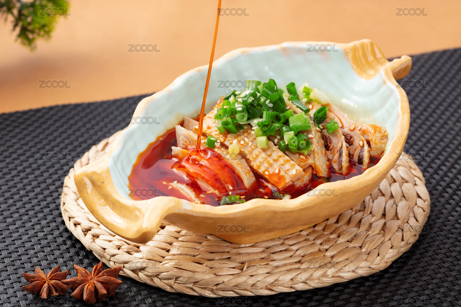 桌上葉形碗里正在淋紅油的川菜涼菜口水雞