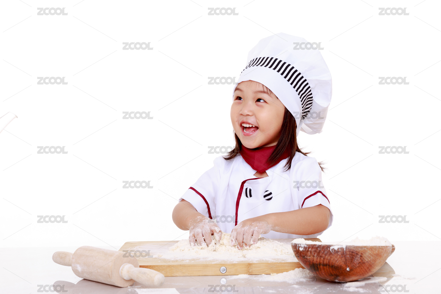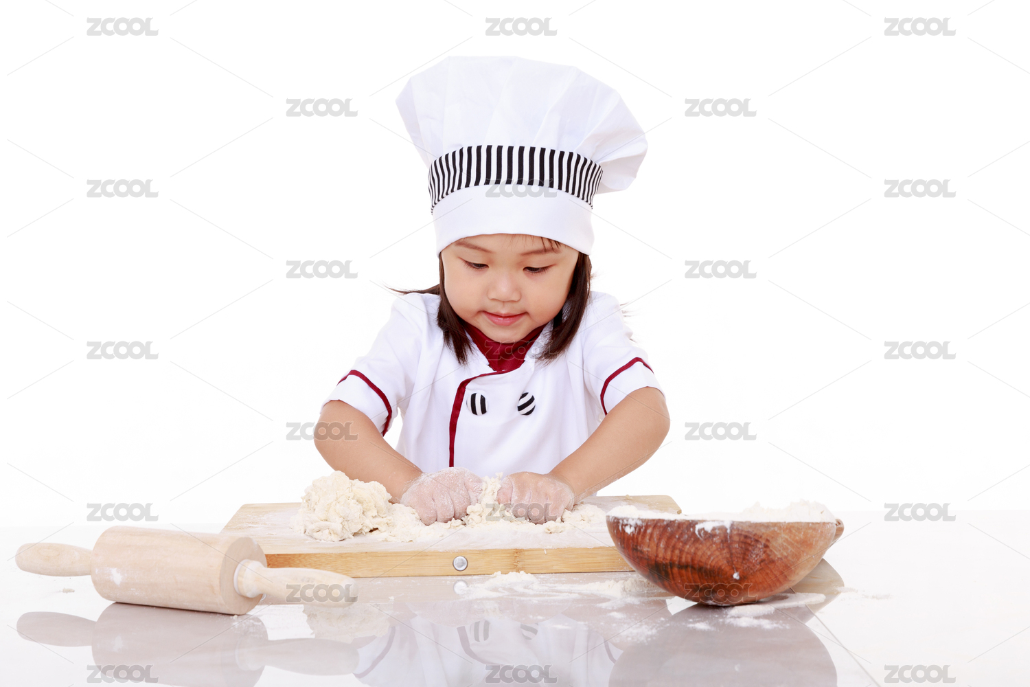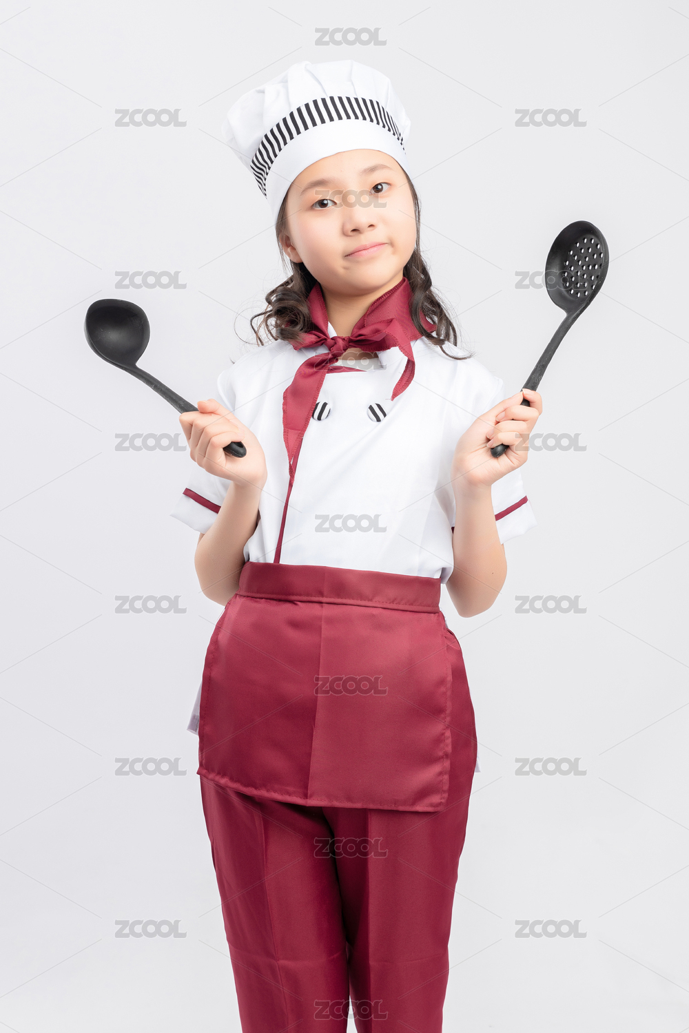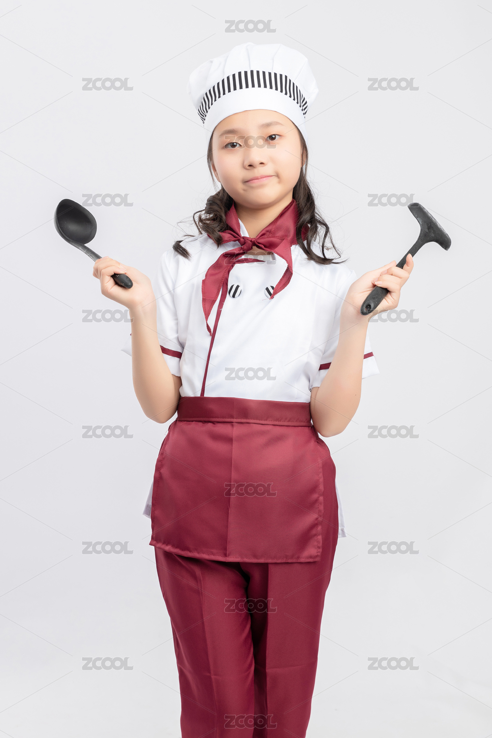 白色背景前穿著廚師服手拿搟面杖的小女孩