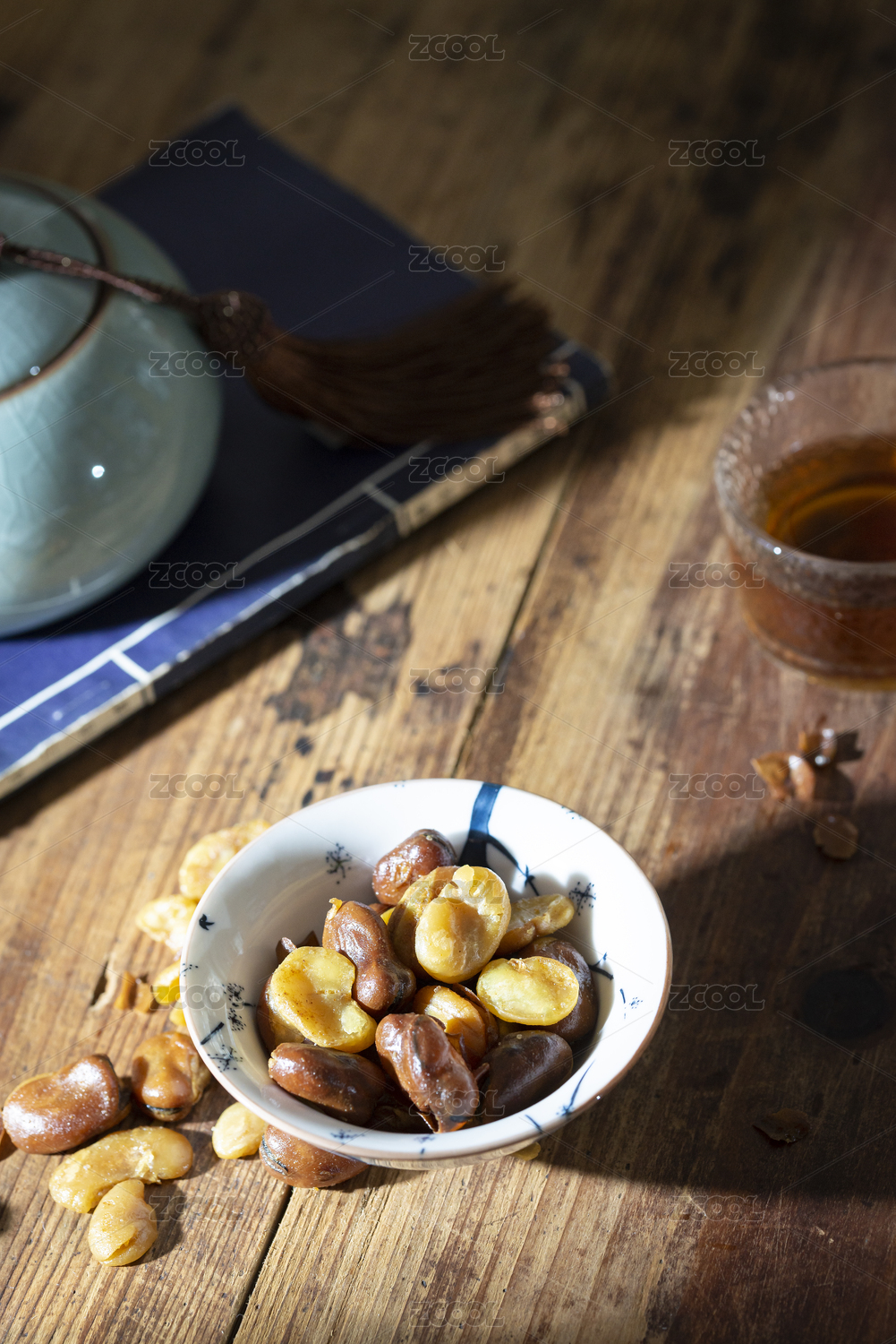 桌面上擺放的老酒蠶豆和線裝書,福建龍巖