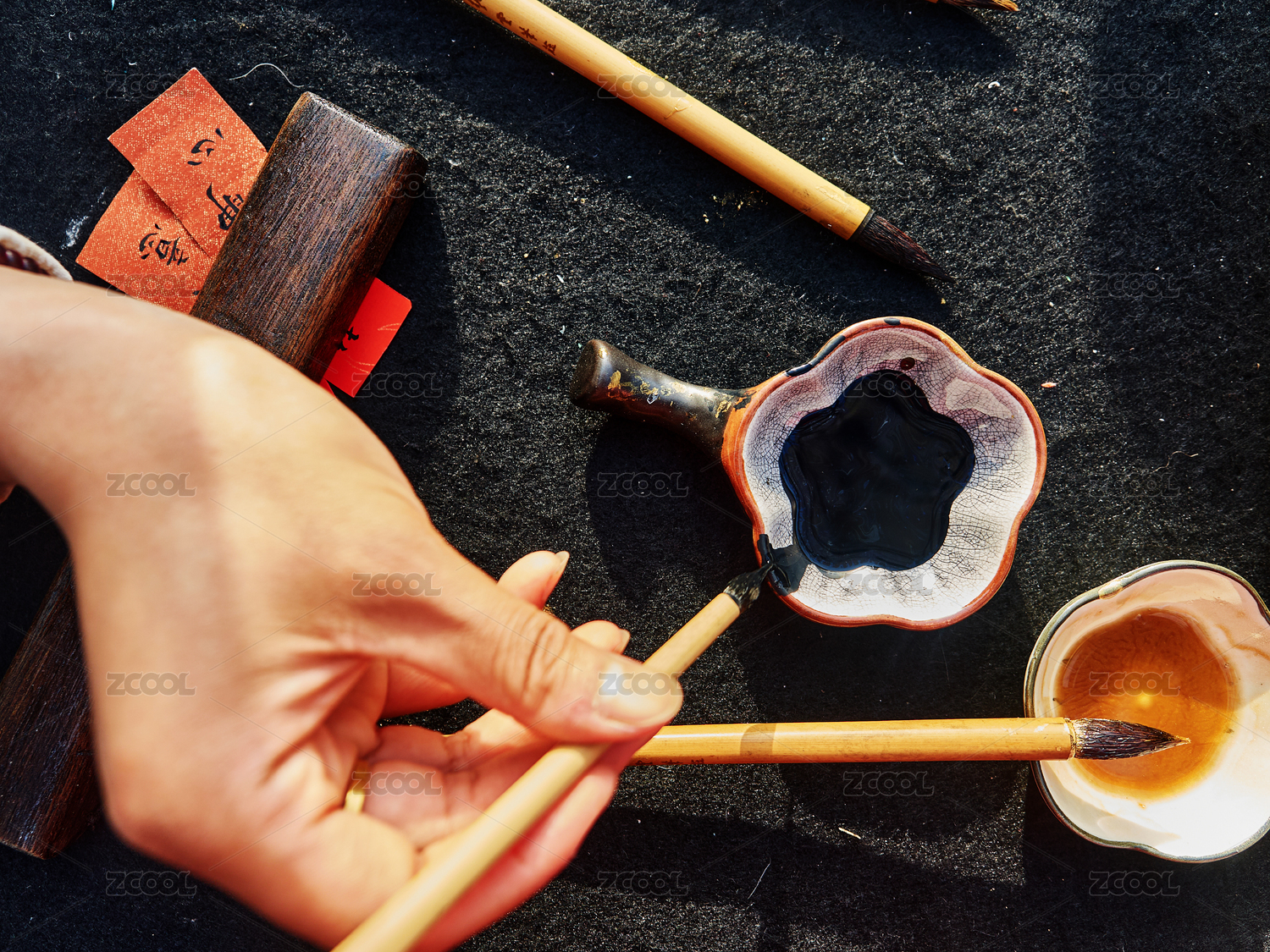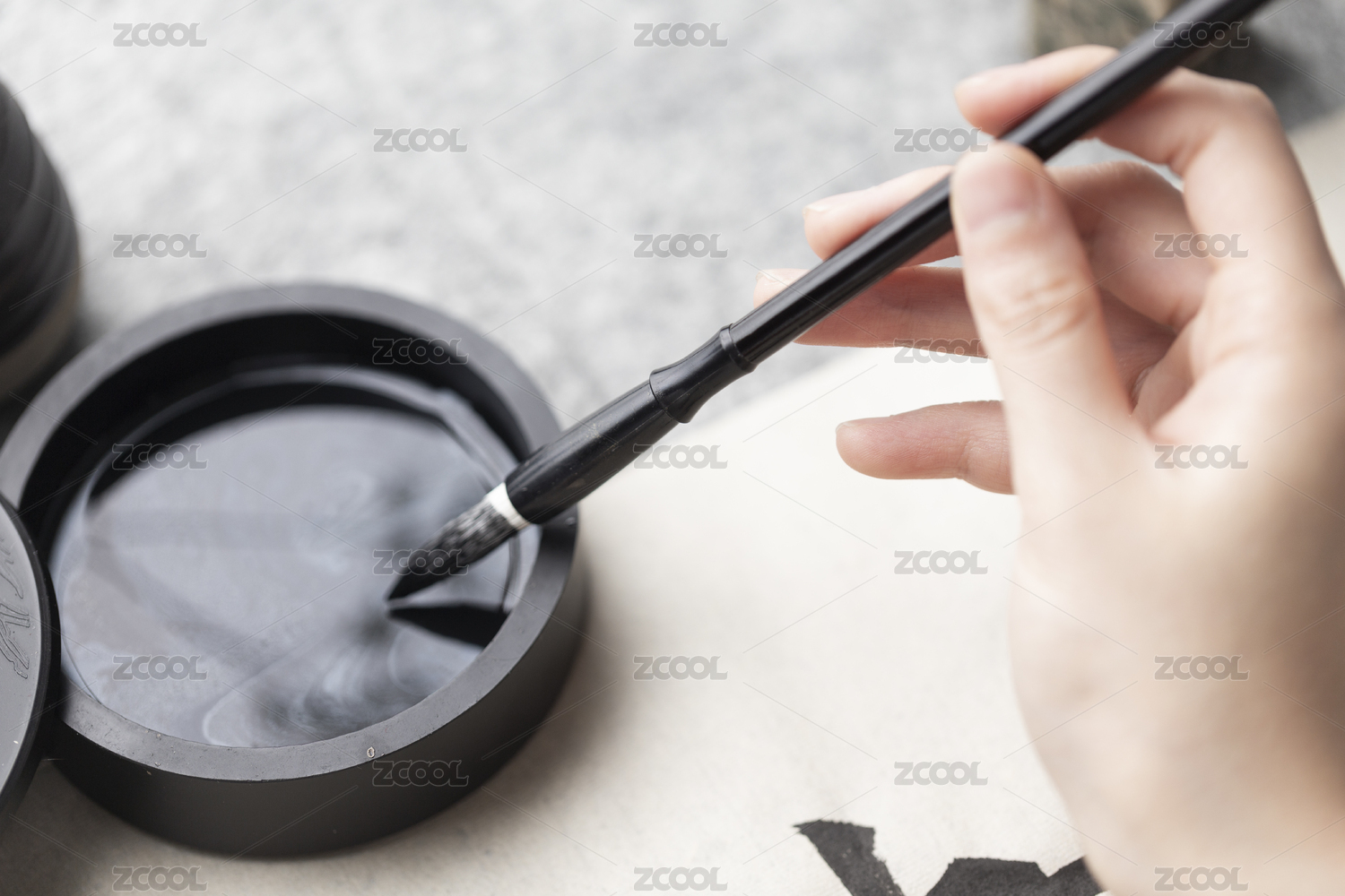手拿毛筆蘸墨水