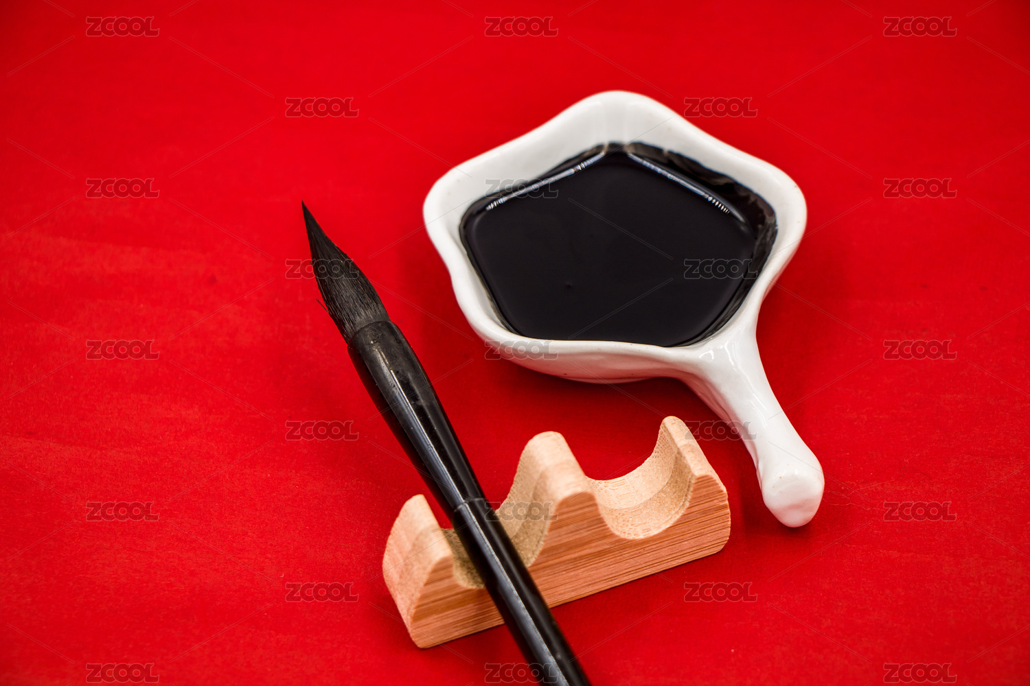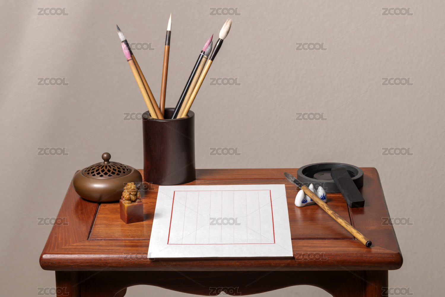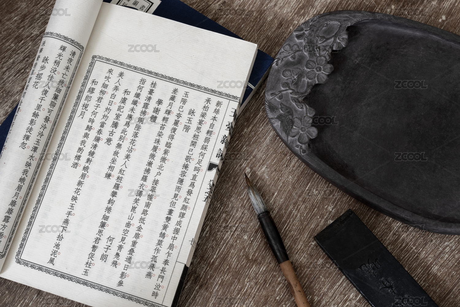 木質(zhì)桌面上的筆墨硯