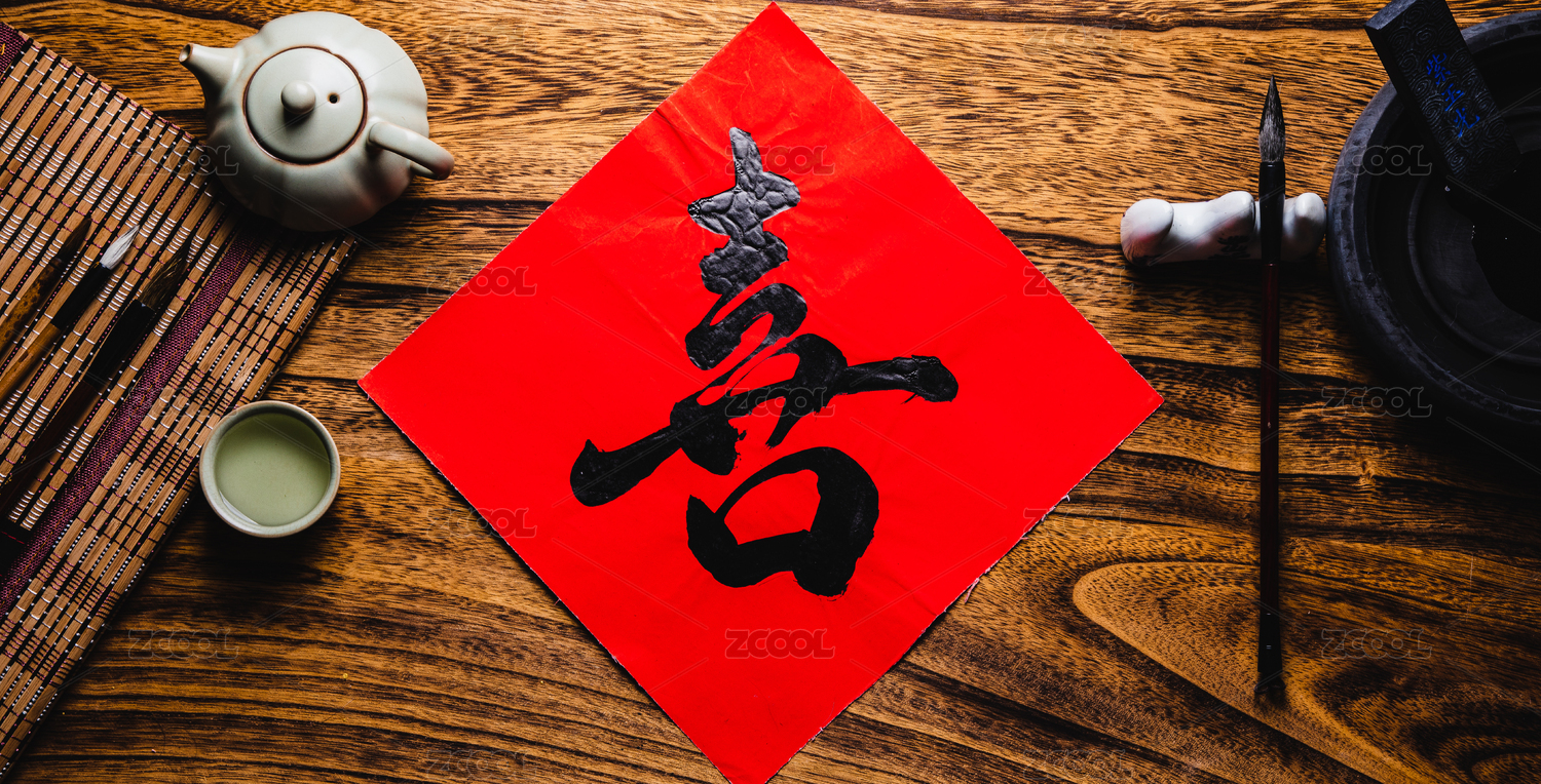 擺著紅色背景上的筆墨紙硯和對(duì)聯(lián)紅包