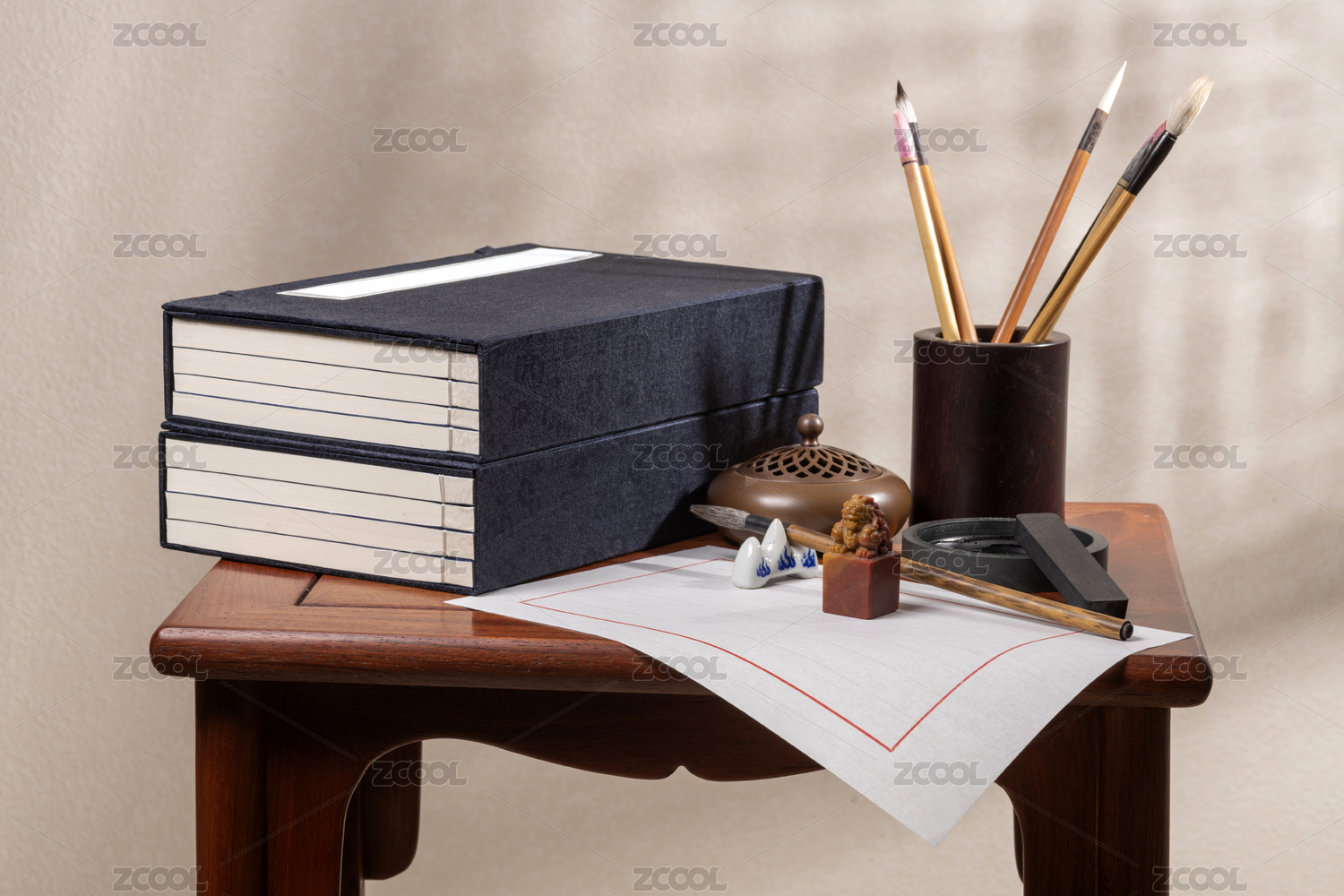 傳統(tǒng)文房四寶紙筆墨硯擺放在案臺(tái)上