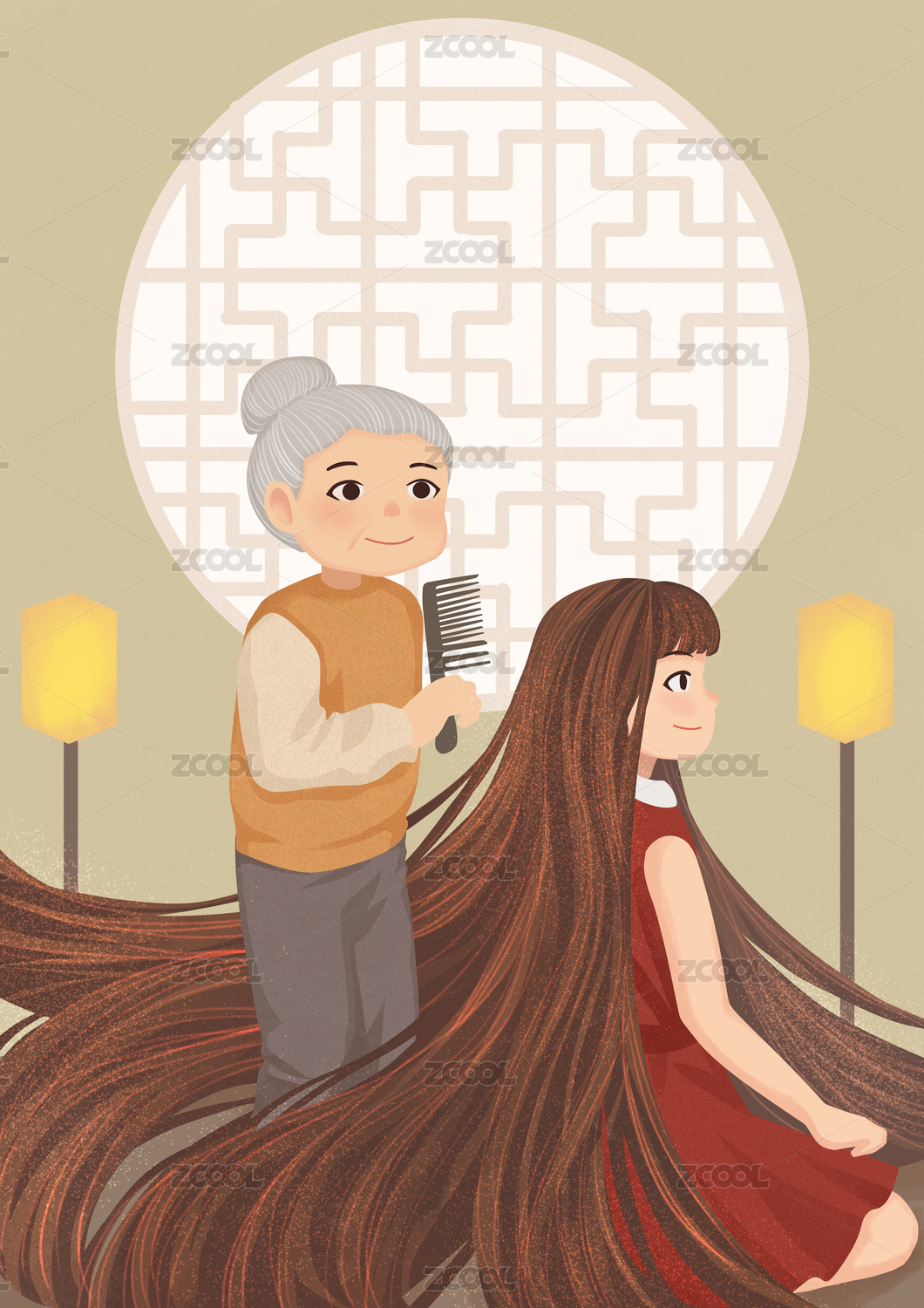 祖母為女孩梳頭
