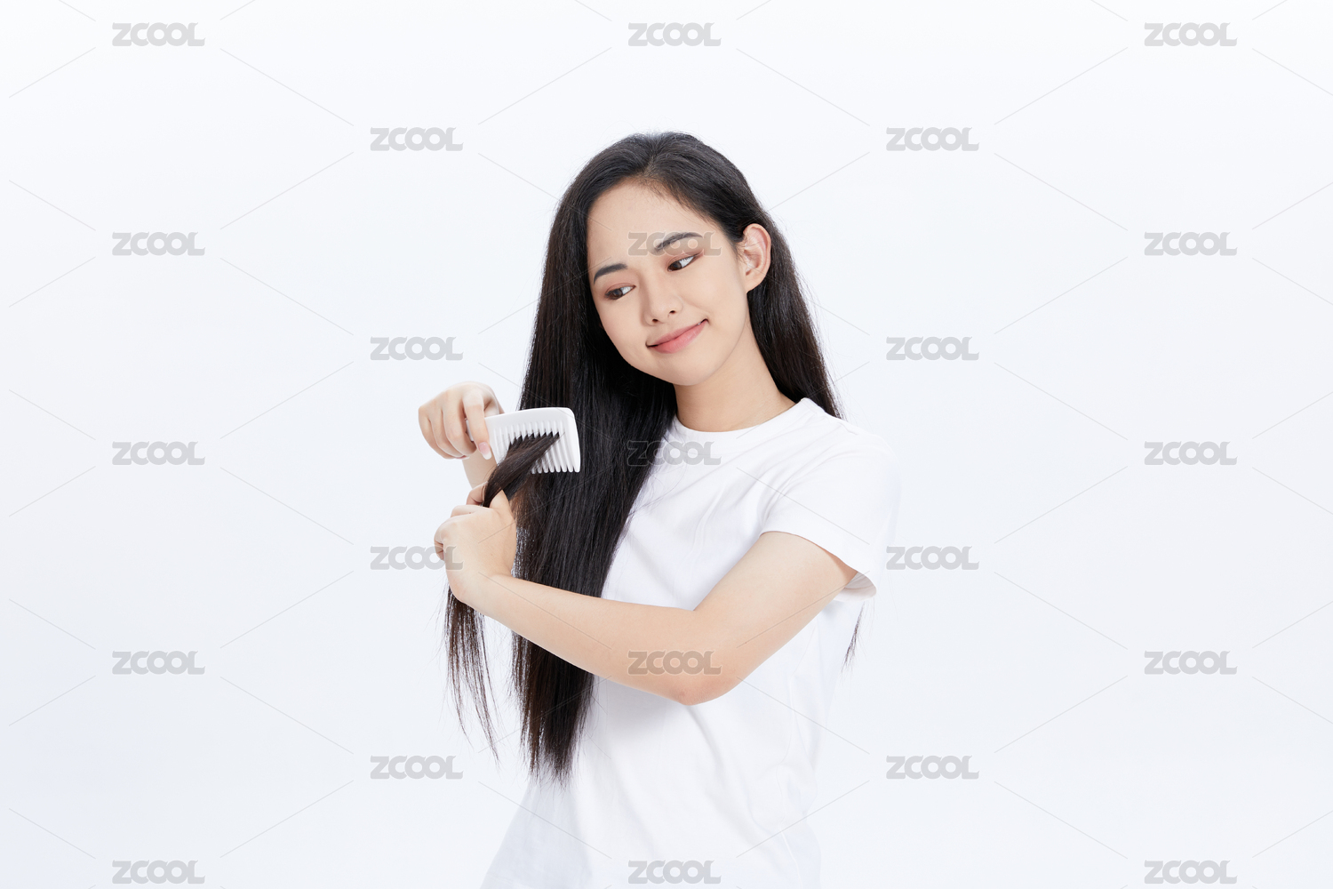 黑色長(zhǎng)發(fā)女生微笑梳頭