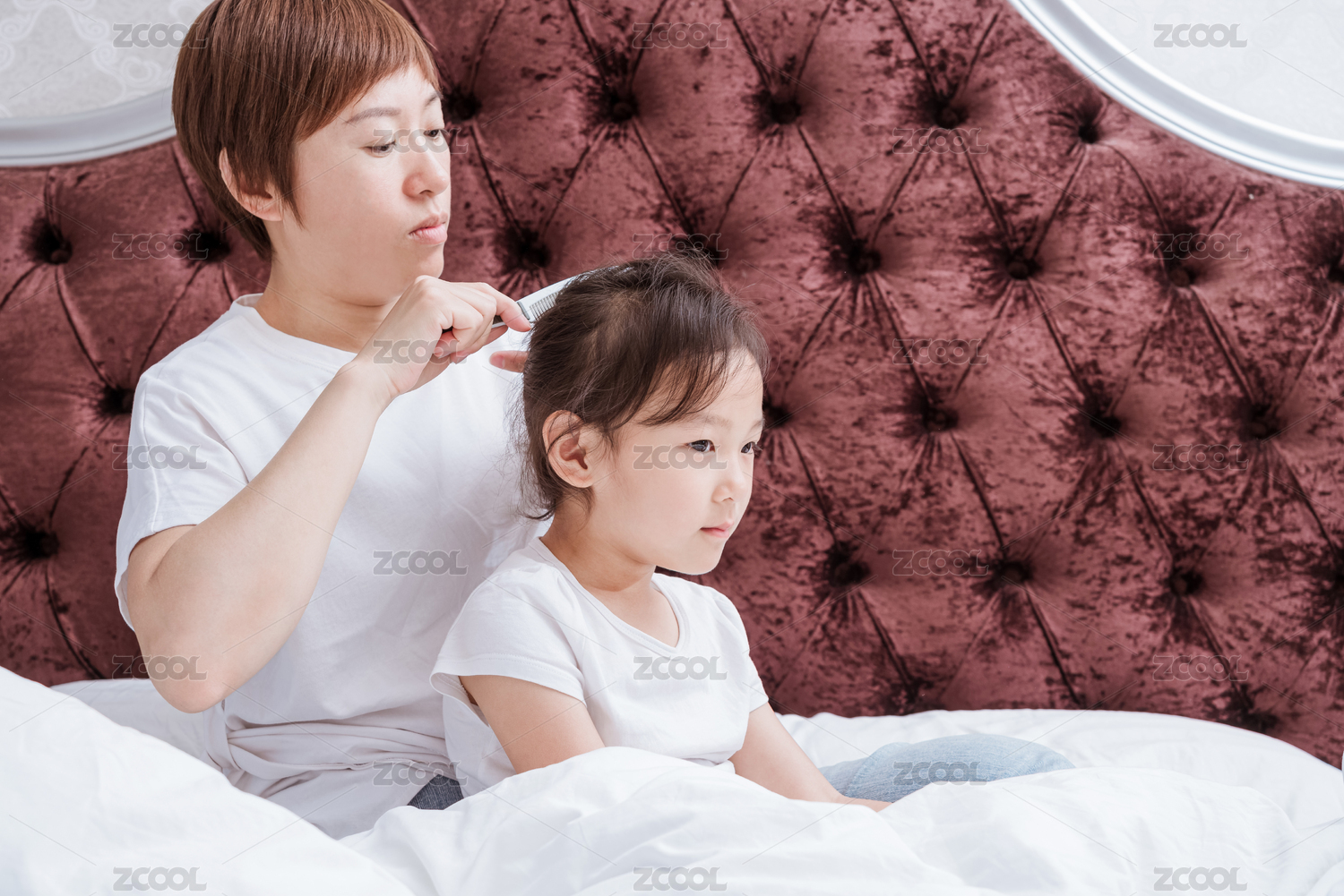 穿白色襯衣的母親坐在床上給女兒梳頭
