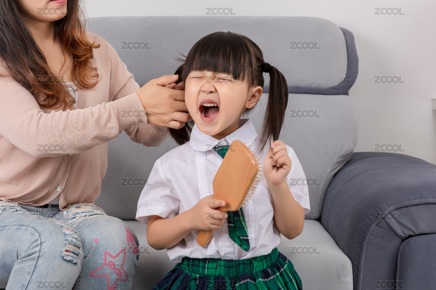 媽媽為女孩梳頭發(fā)時(shí)疼的張大了嘴巴