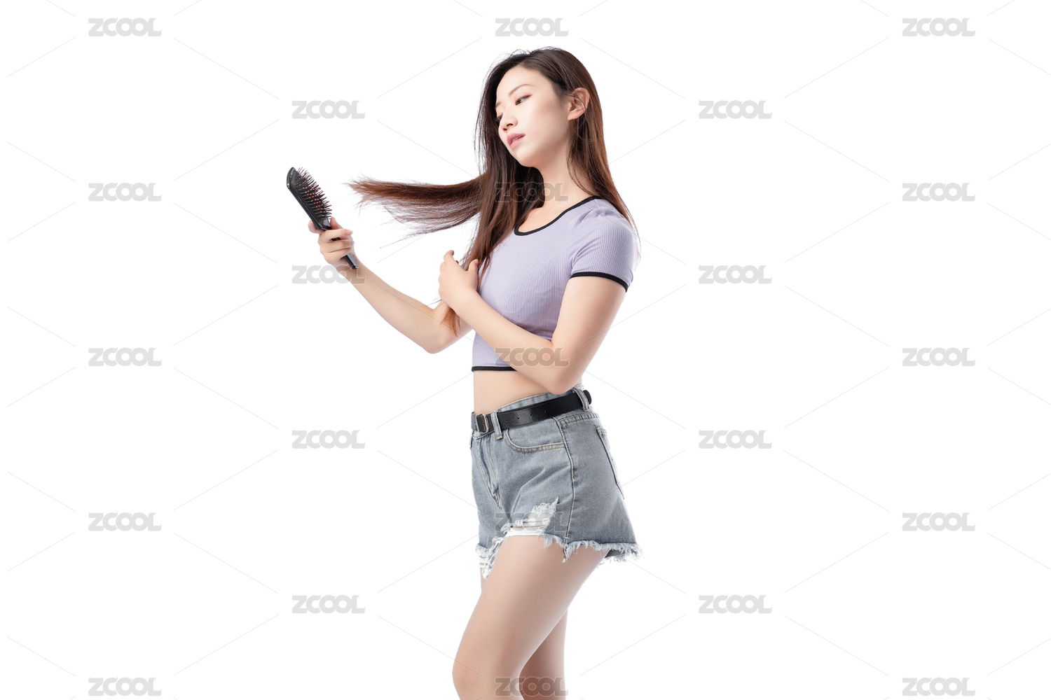 白色背景里,正在梳頭的時(shí)尚亞洲女孩