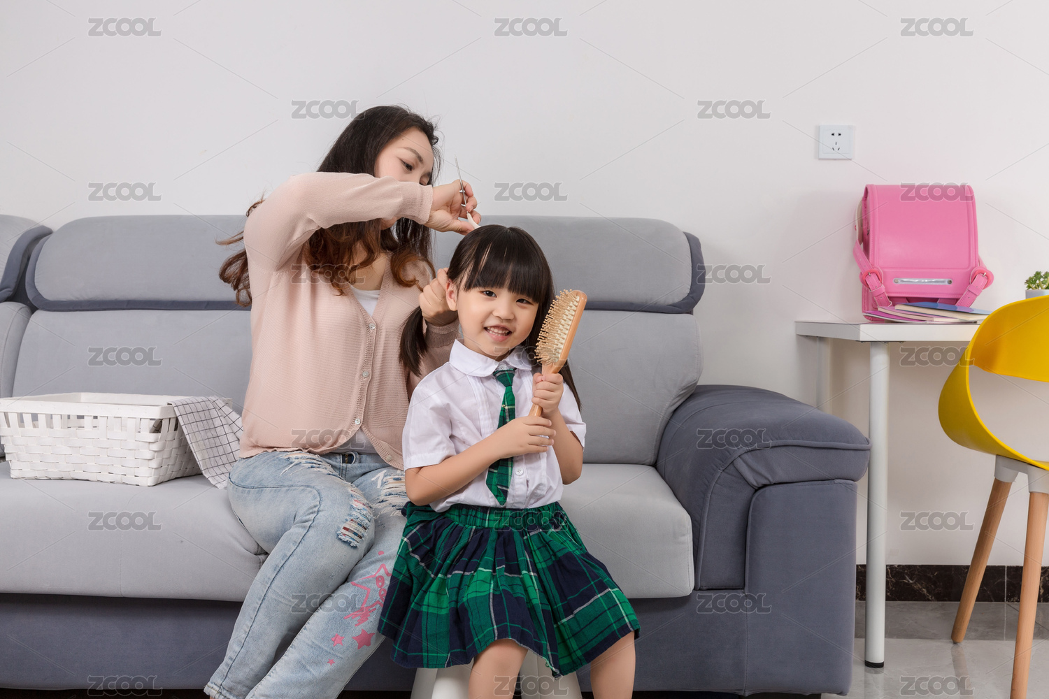 媽媽為上學(xué)前的女兒梳頭發(fā)