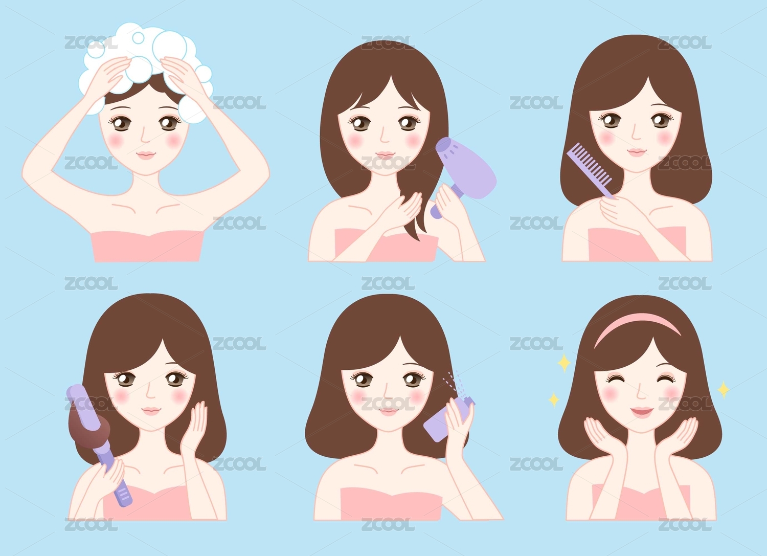 洗頭發(fā)美發(fā)做頭發(fā)卷發(fā)梳頭卡通少女插圖