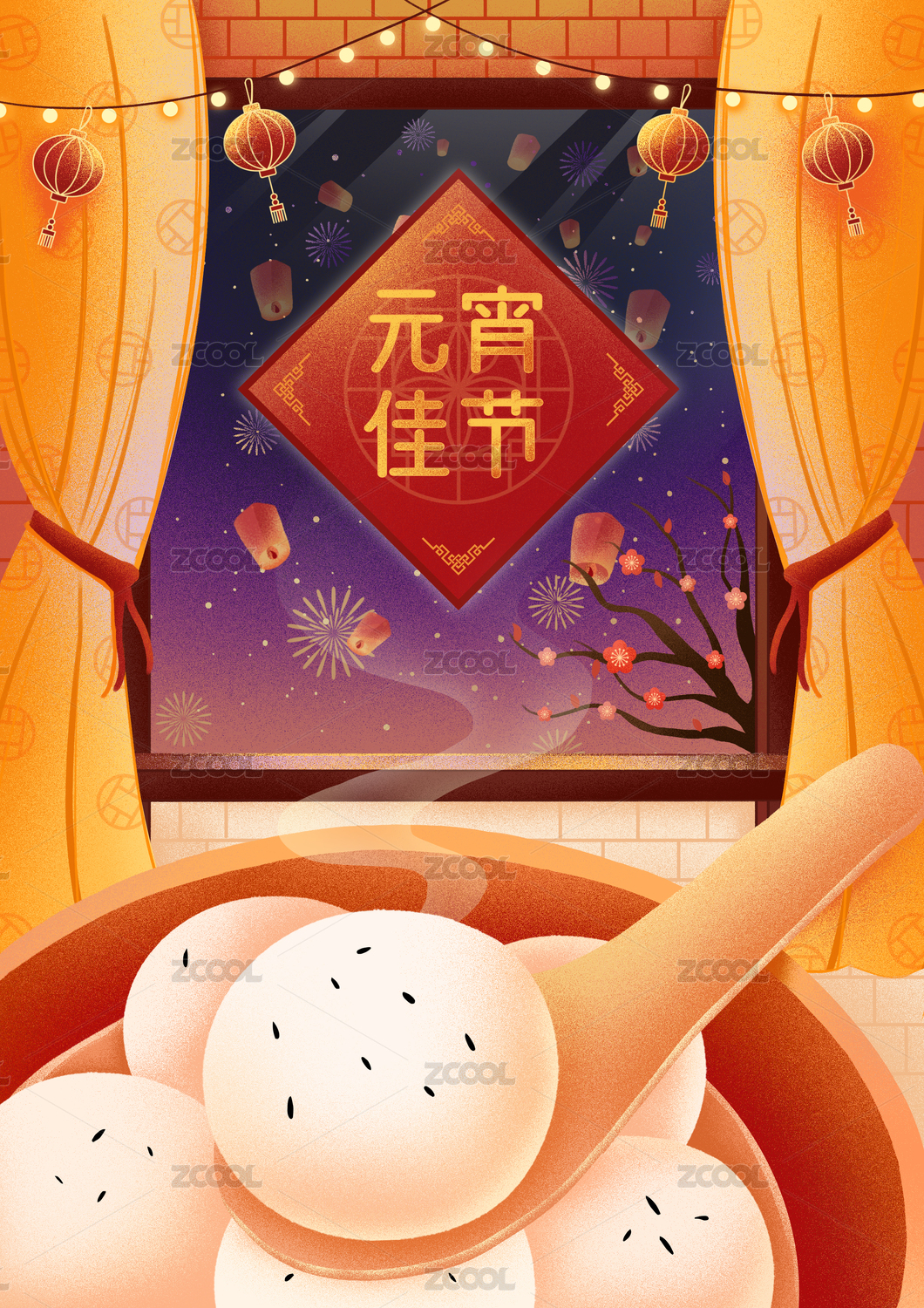 元宵節(jié)吃湯圓賞花燈噪點插畫