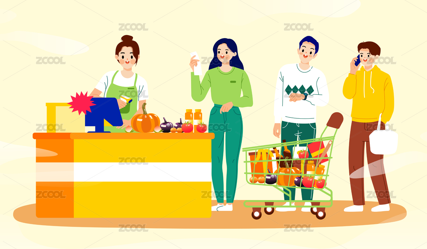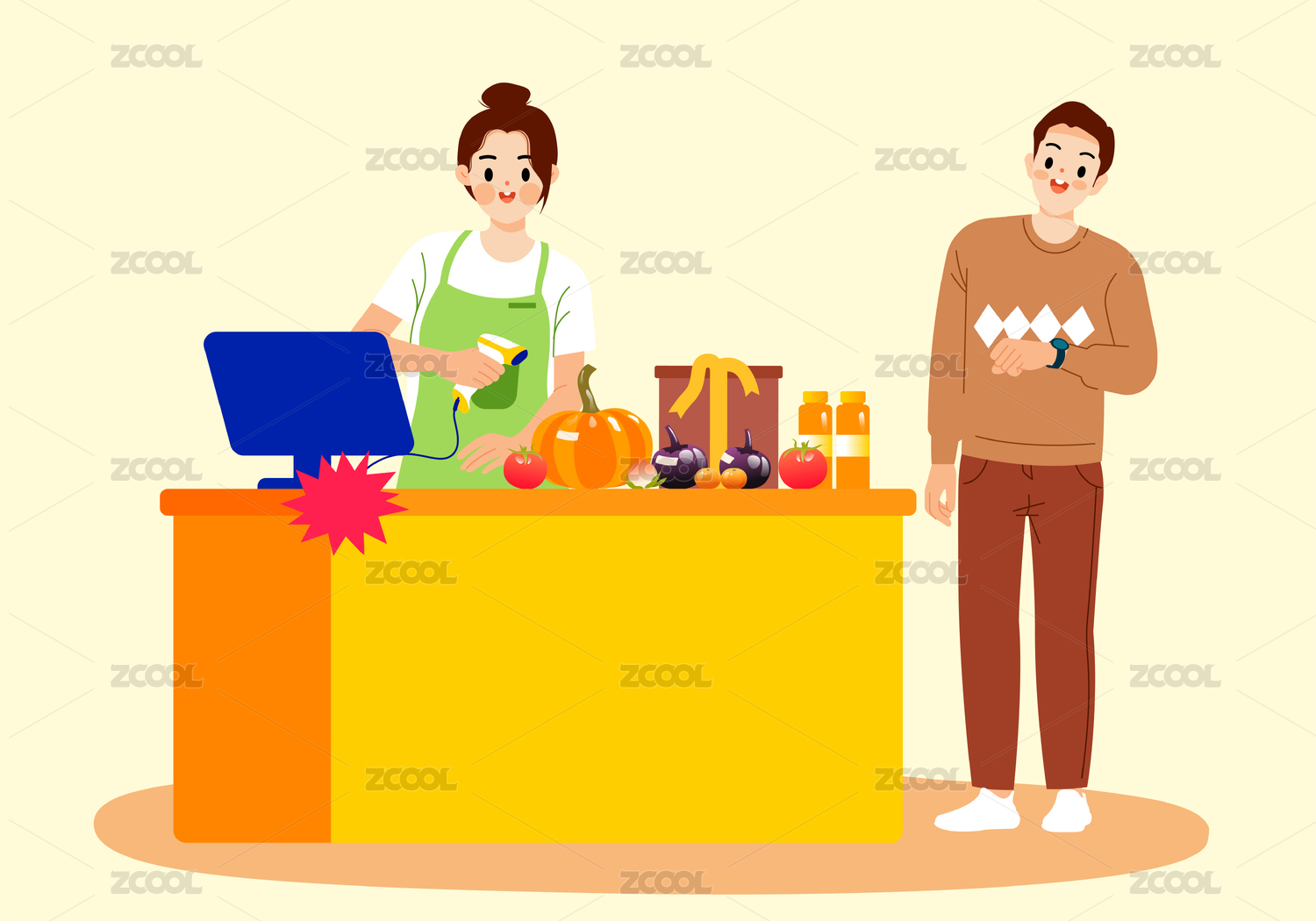 新年超市收銀員矢量插畫