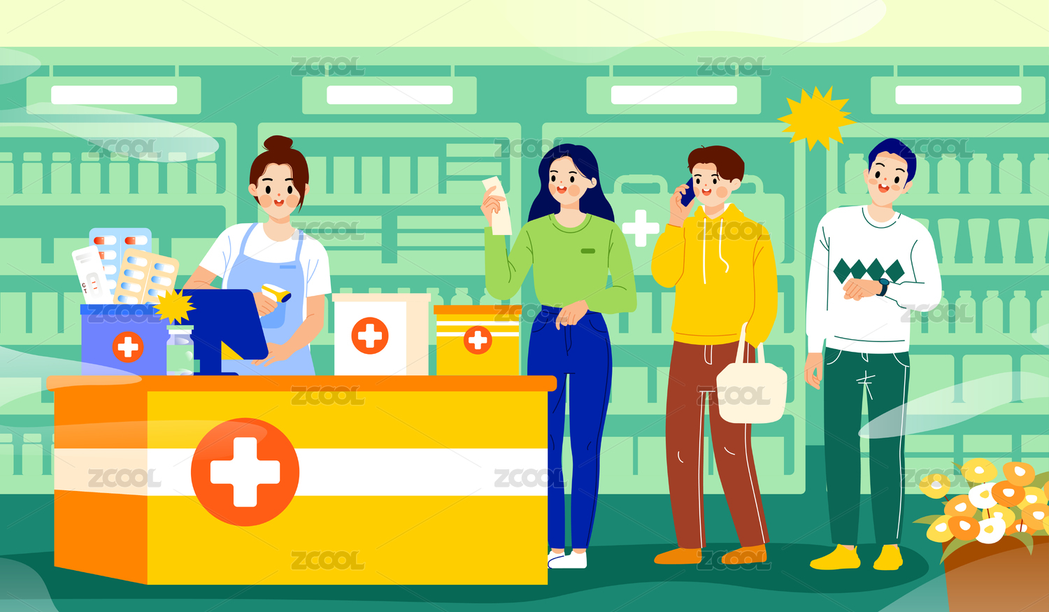 人們在藥店排隊買藥結(jié)賬