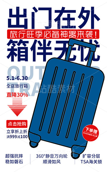 電商促銷海報 旅行箱促銷扁平風格