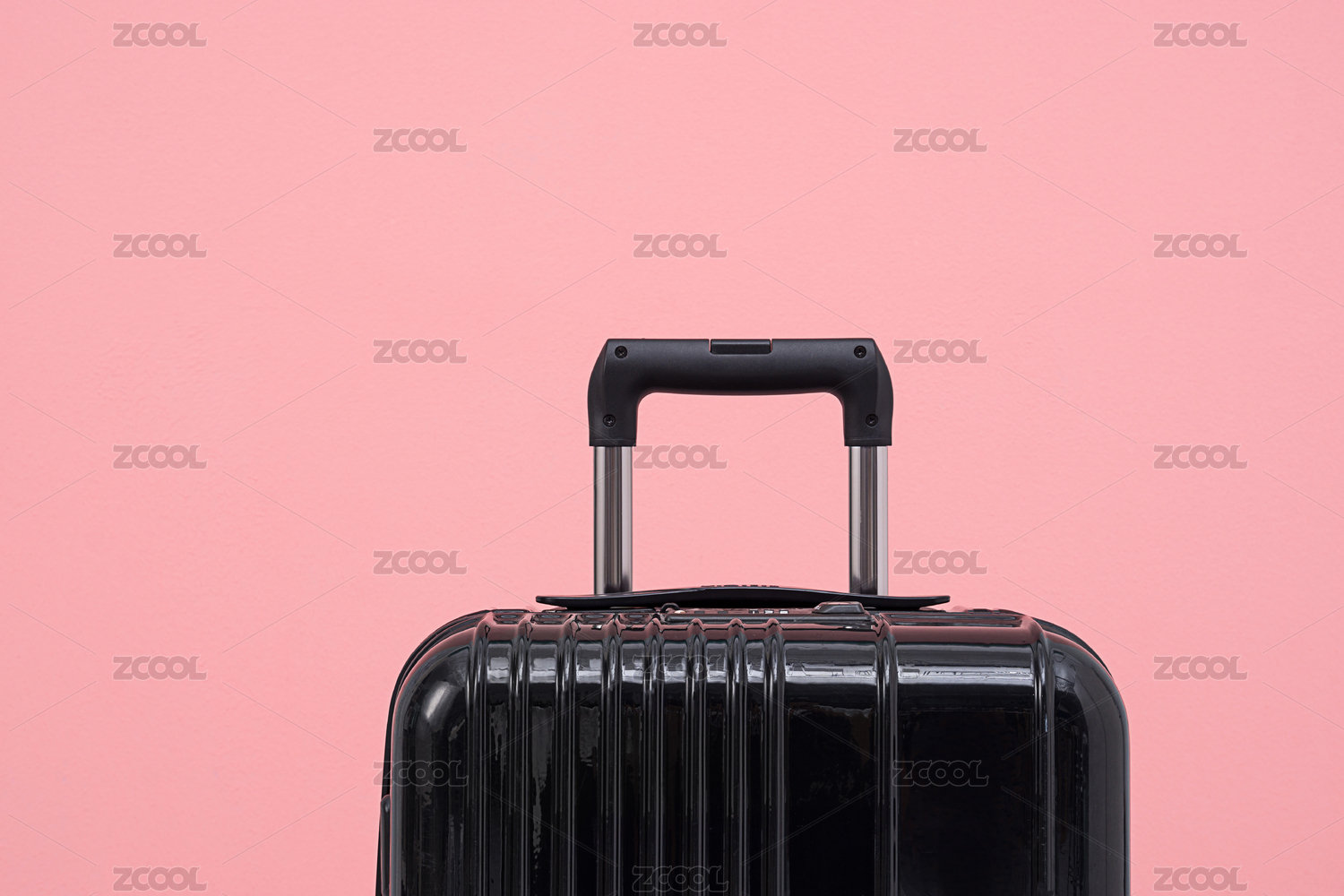 擺放在粉色背景前的黑色拉桿旅行箱