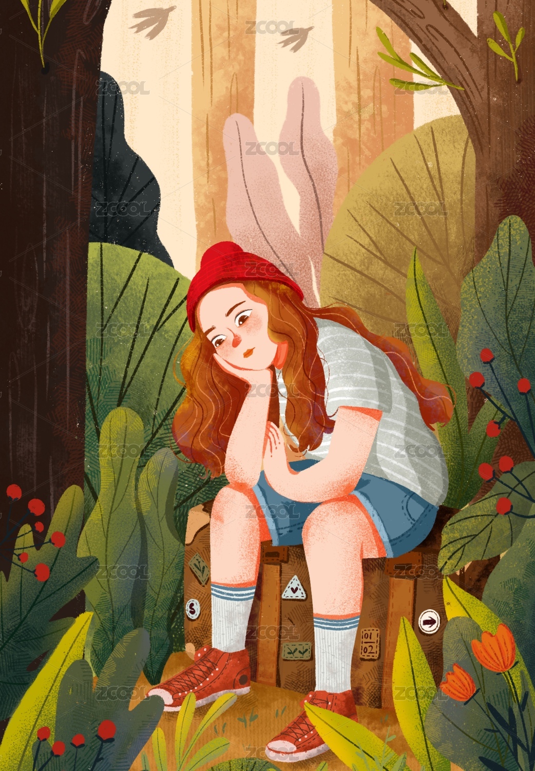 坐在旅行箱上的女孩在叢林中思考問題