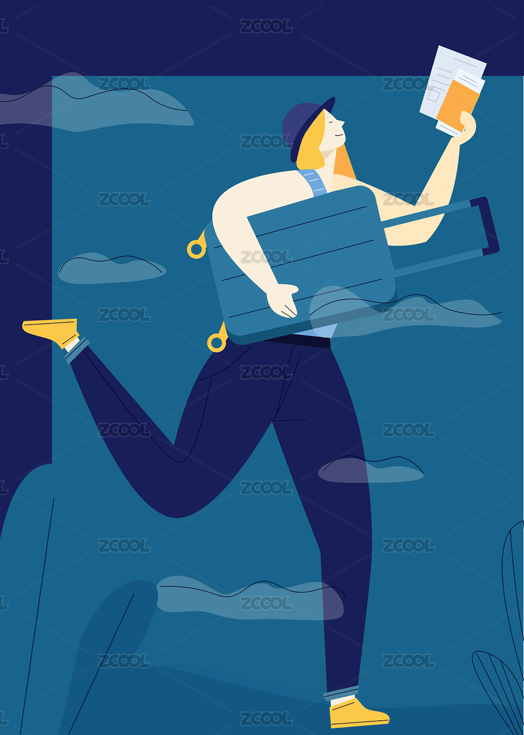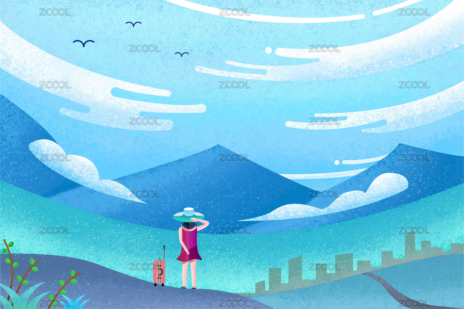 假期旅行插畫手拿行李箱的女孩