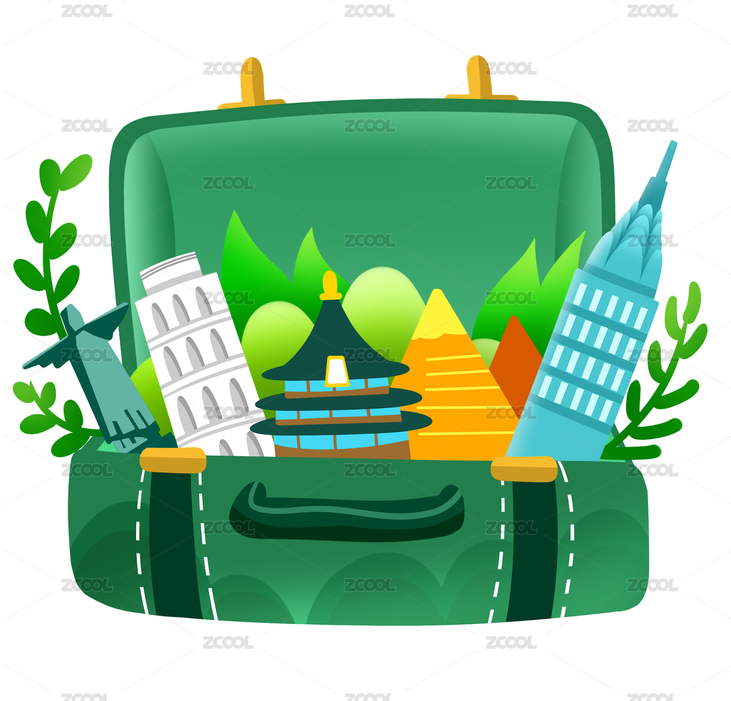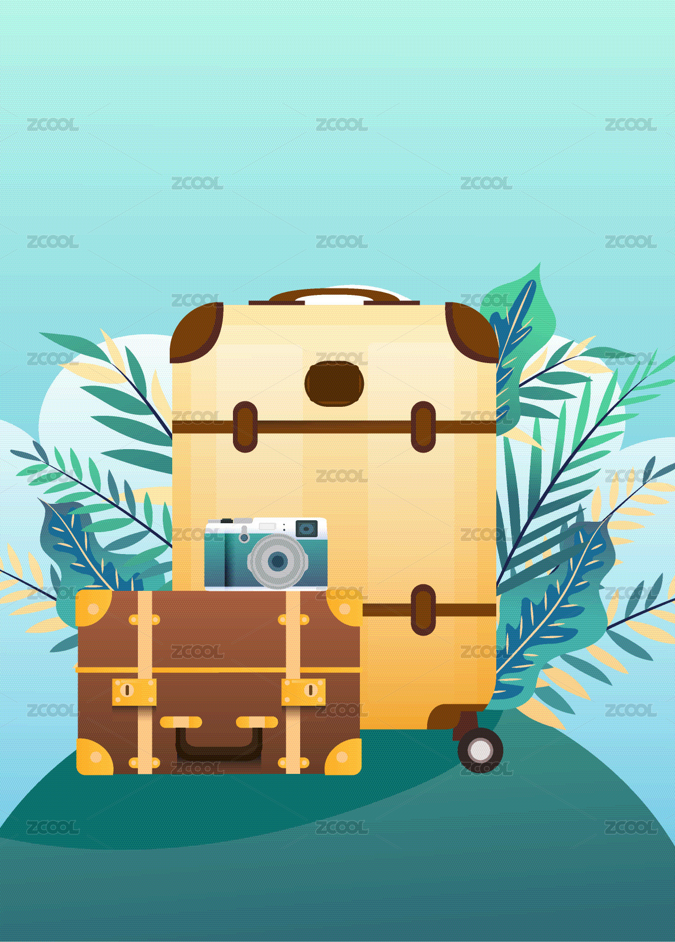 旅行箱包與綠植背景