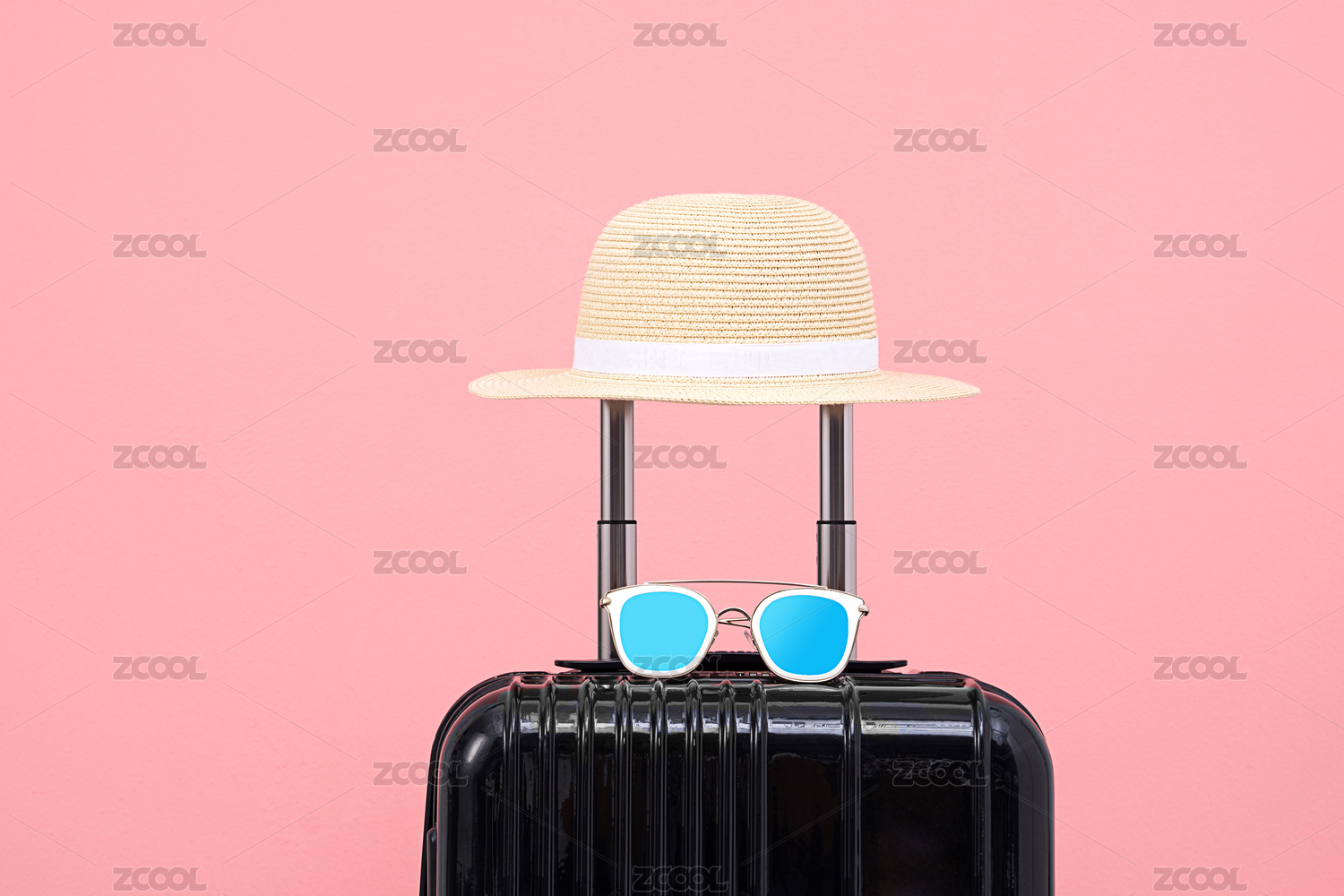 擺放在粉色背景前的帶著草帽的黑色旅行箱與青色太陽鏡
