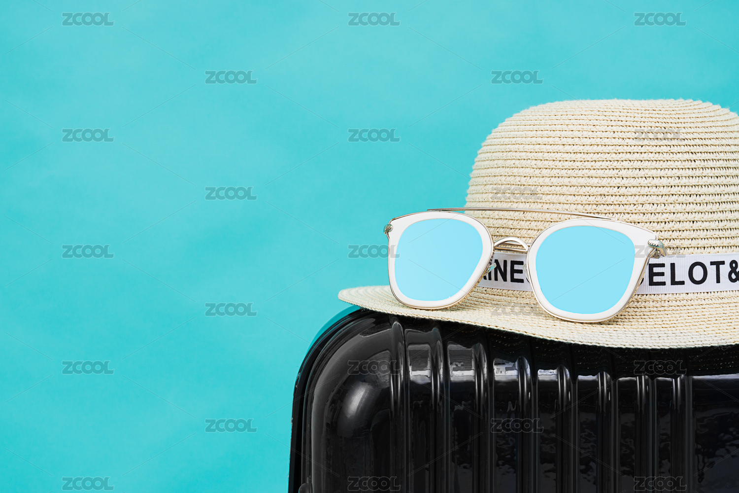 放在黑色旅行箱上的草帽與太陽鏡擺放在青色背景前
