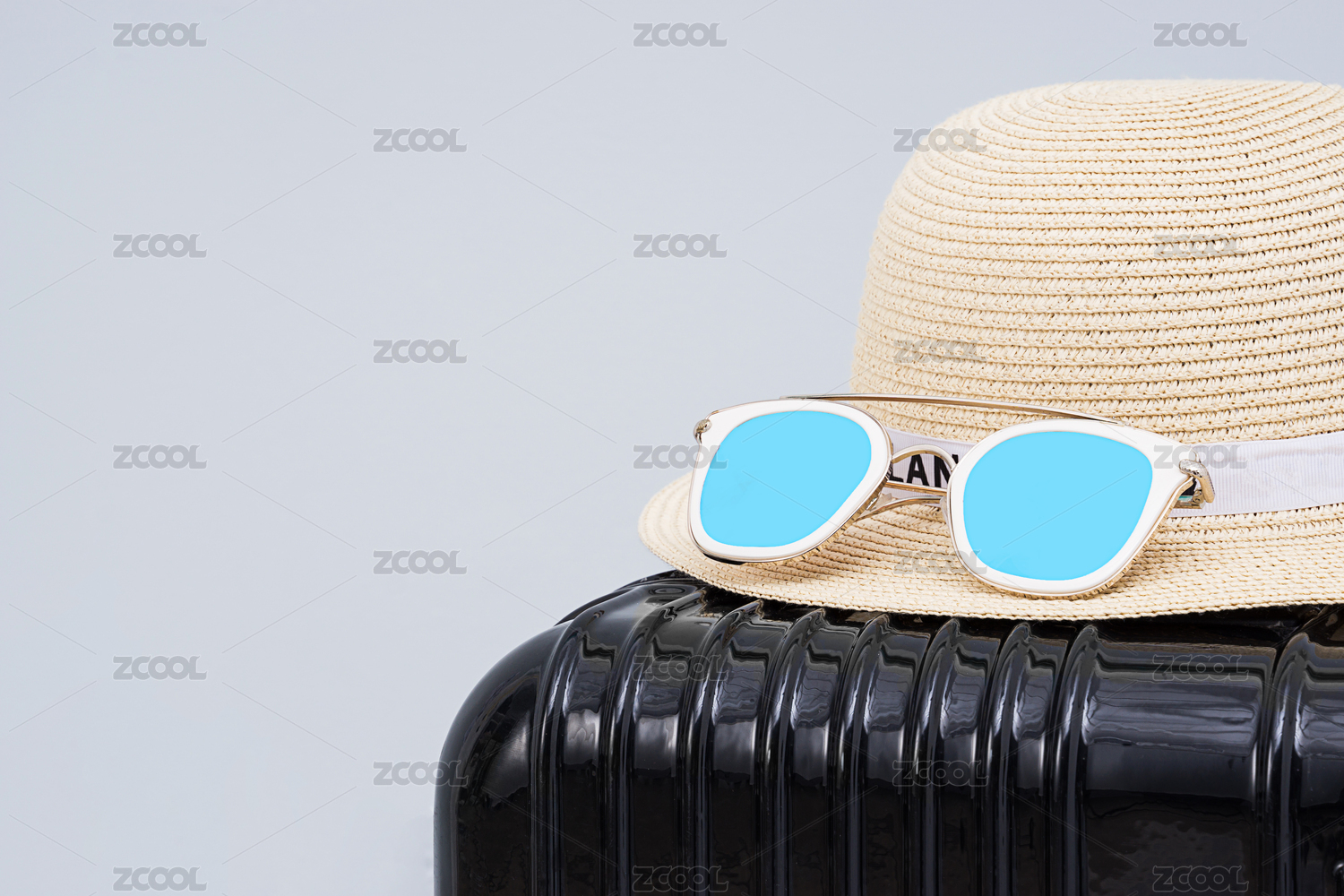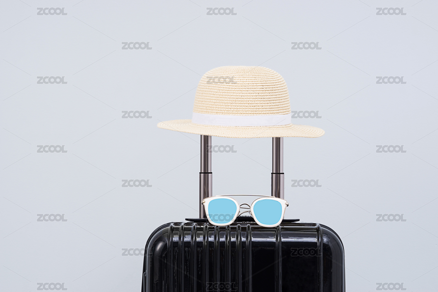 放在黑色旅行箱上面的草帽與太陽鏡擺放在淺灰色背景前