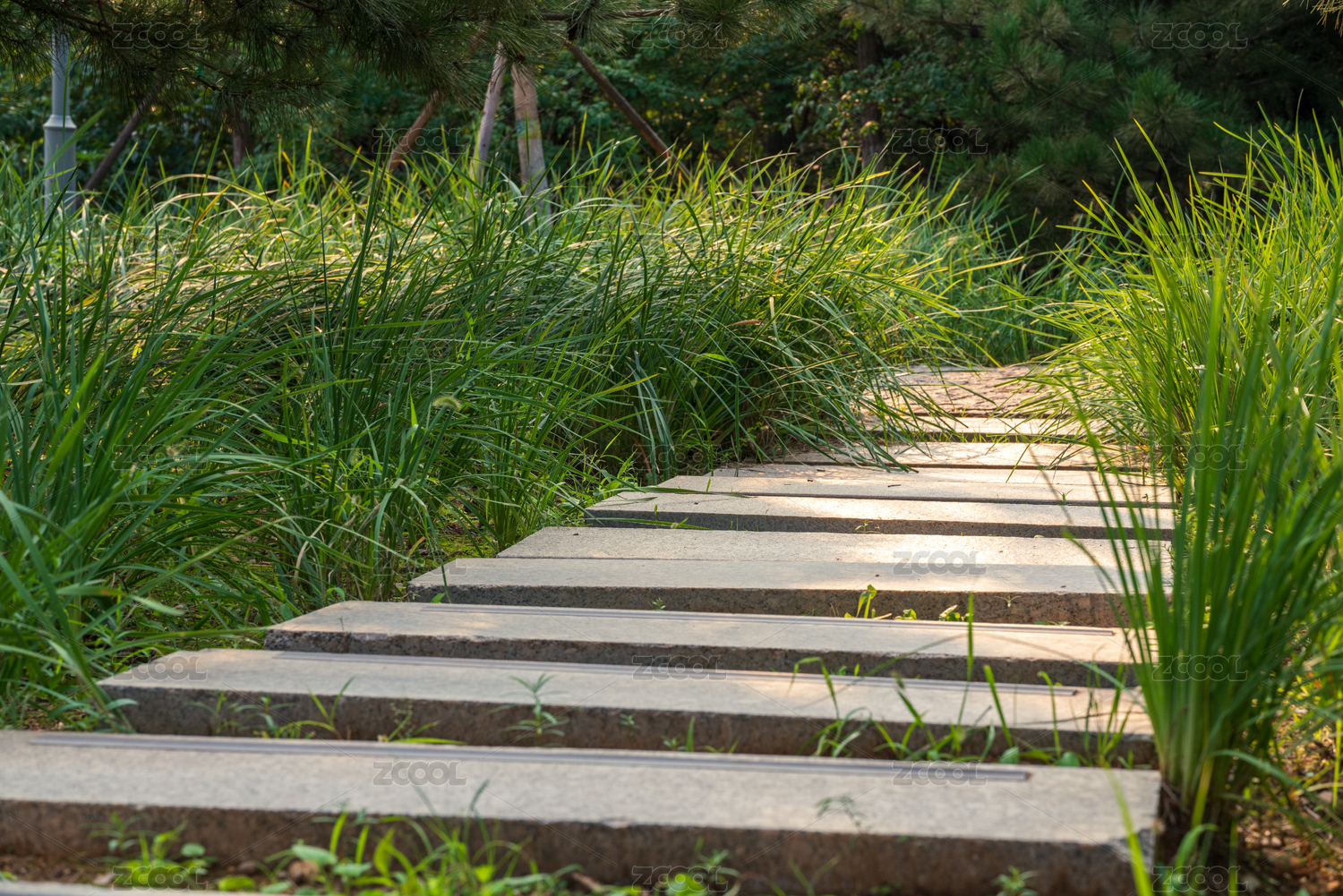 暖陽(yáng)照射下綠意盎然的石板路