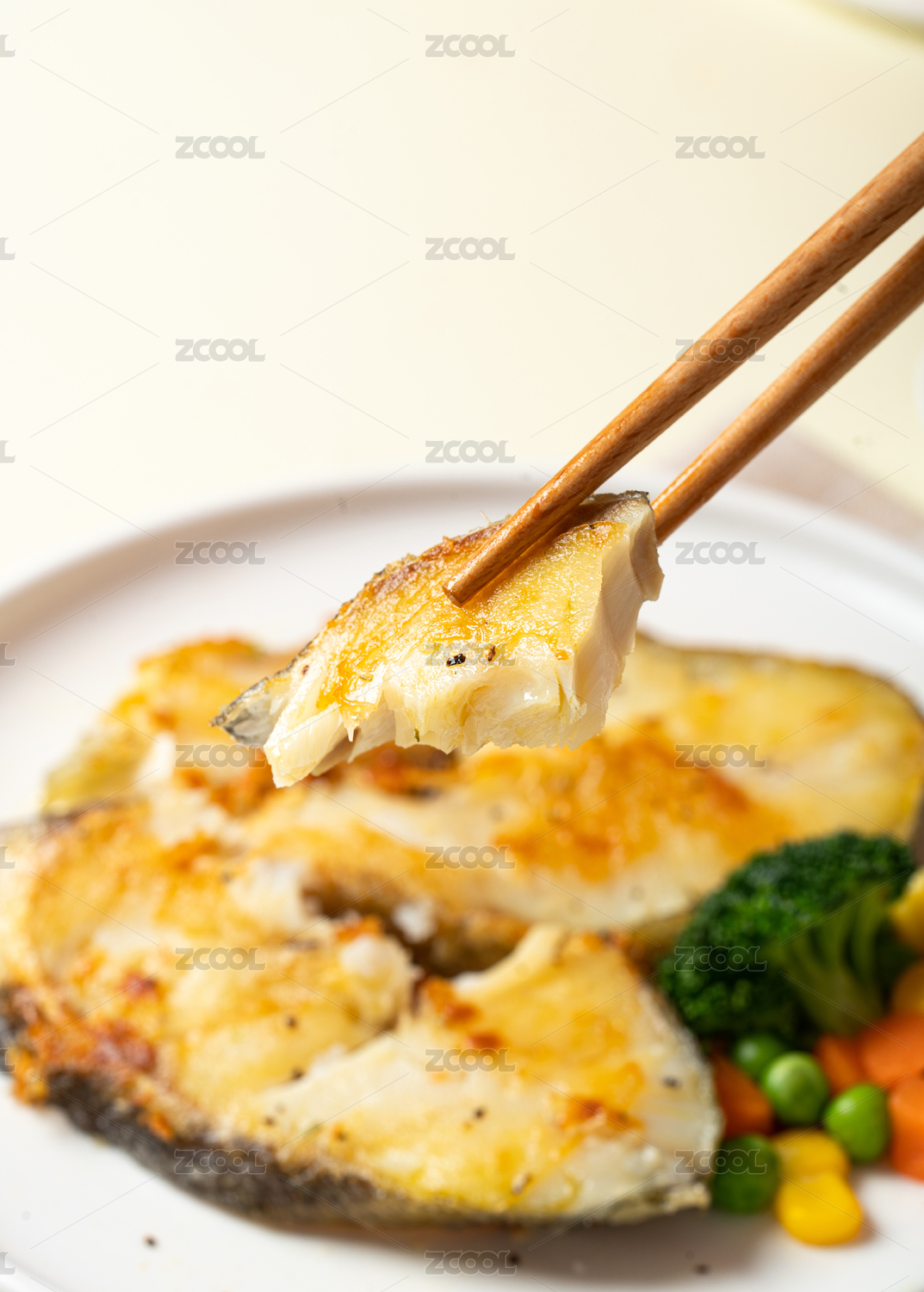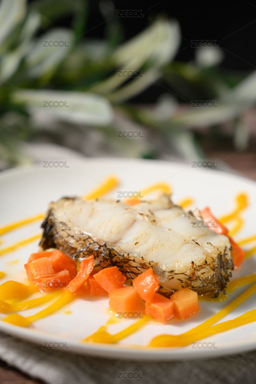 桌面上的盤子里的美味可口的煎鱈魚扒