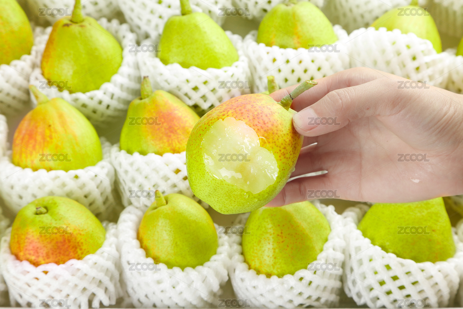 一箱庫(kù)爾勒香梨和手上拿著一個(gè)咬過(guò)的香梨