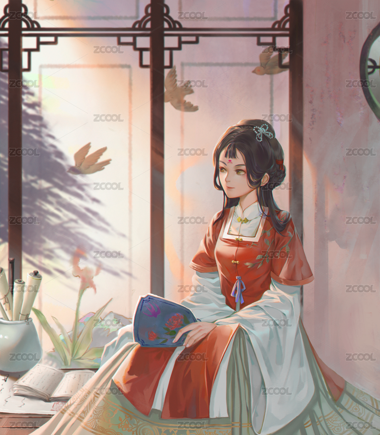 工筆水彩美人拿扇子