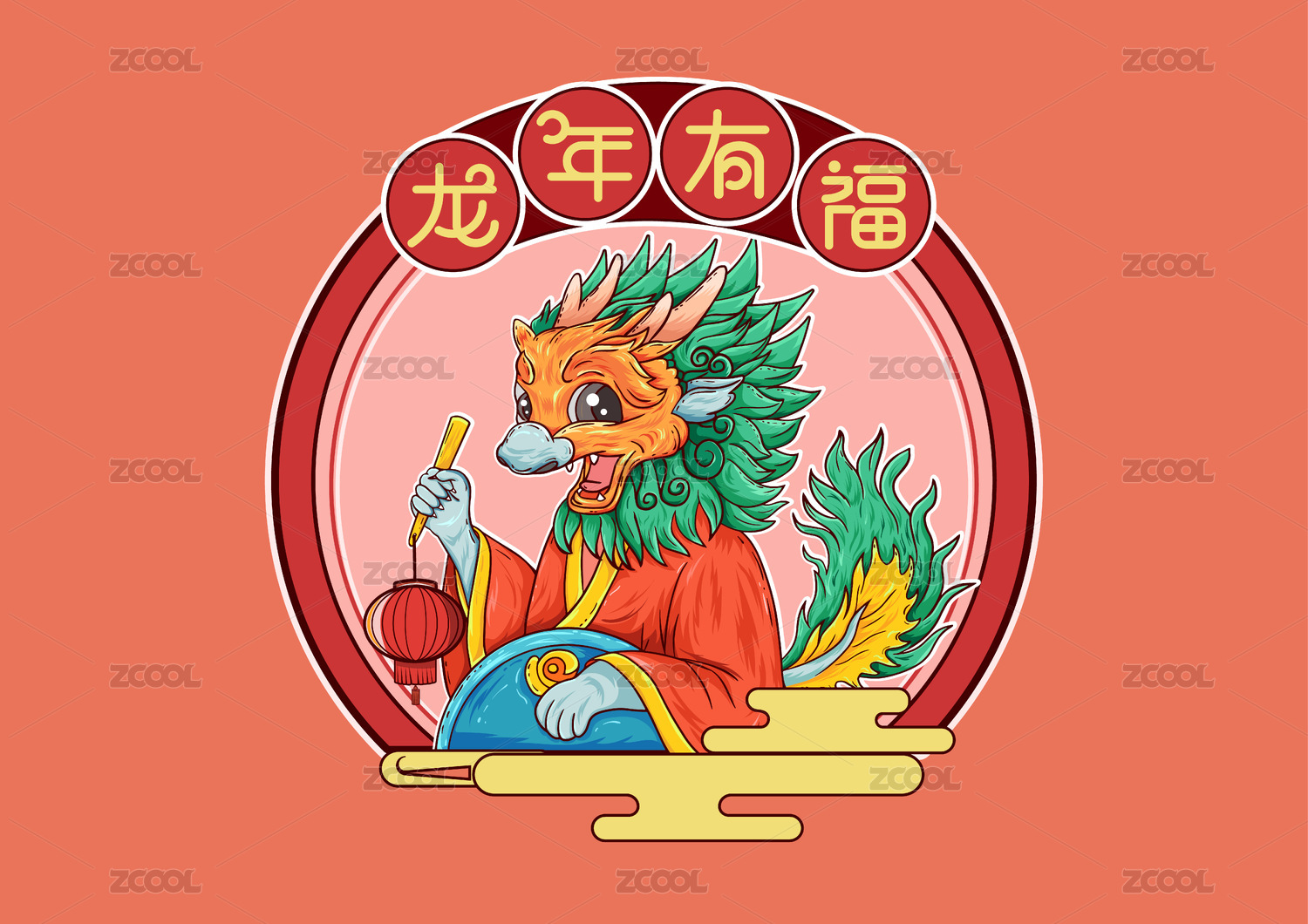 國(guó)潮龍年過(guò)年新春拿扇子的龍燈籠矢量插畫(huà)