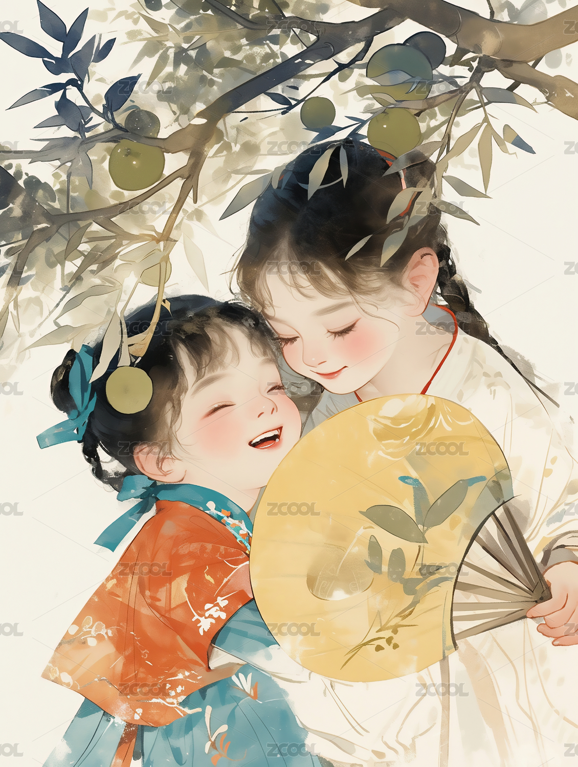 傳統(tǒng)水墨中國(guó)畫(huà)人物,拿扇子擁抱的兩個(gè)女童