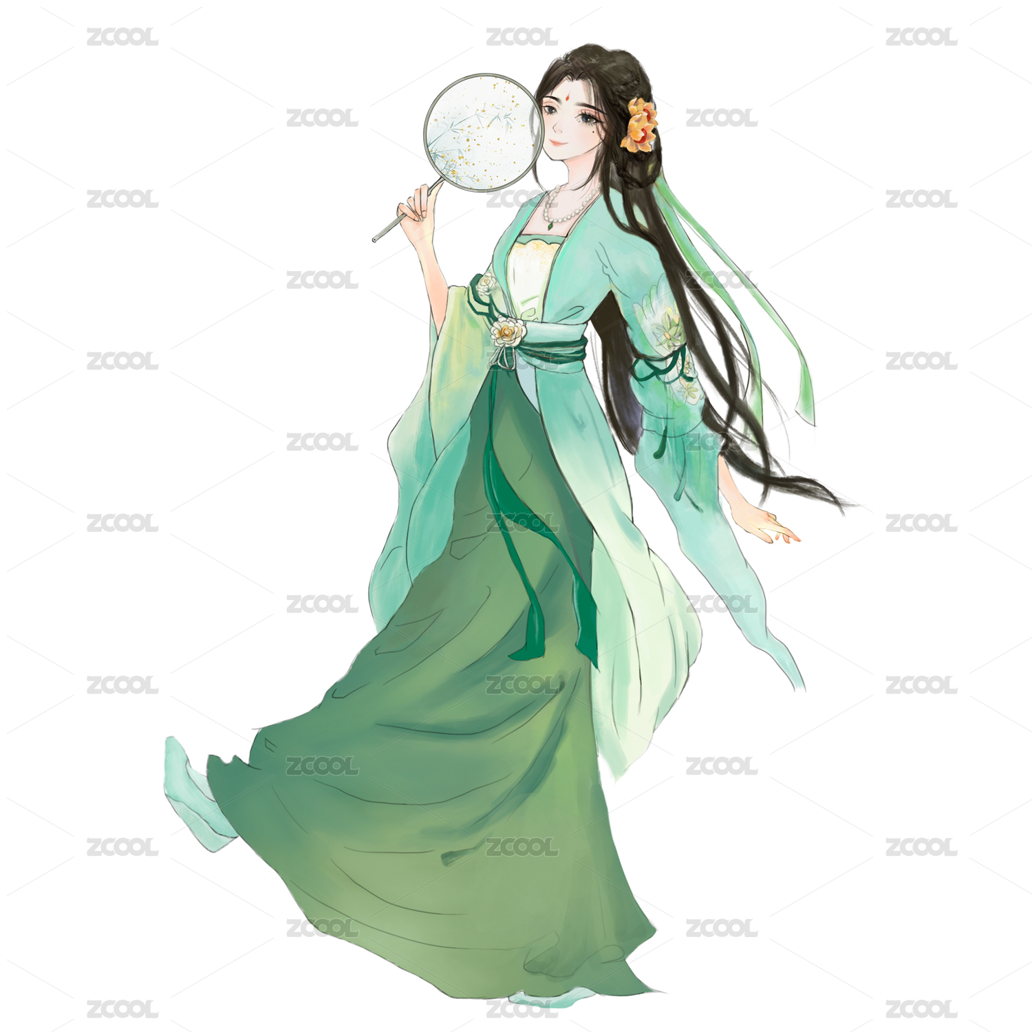 古裝活潑俏皮拿扇子的綠衣女生