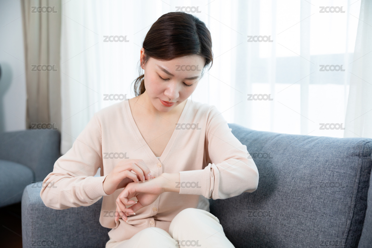 年輕女性抓撓手臂皮膚