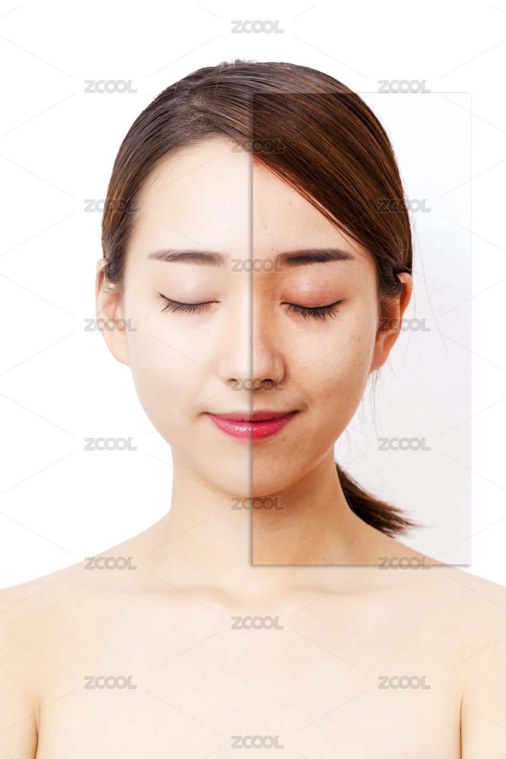 年輕的女性和改變的皮膚,光滑的皮膚和粗糙的皮膚對比,前后改變