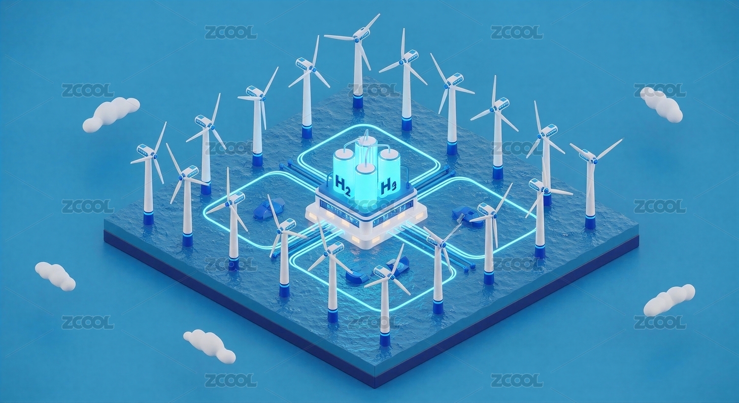 帶有風(fēng)力發(fā)電機(jī)和白云的氫燃料加注站