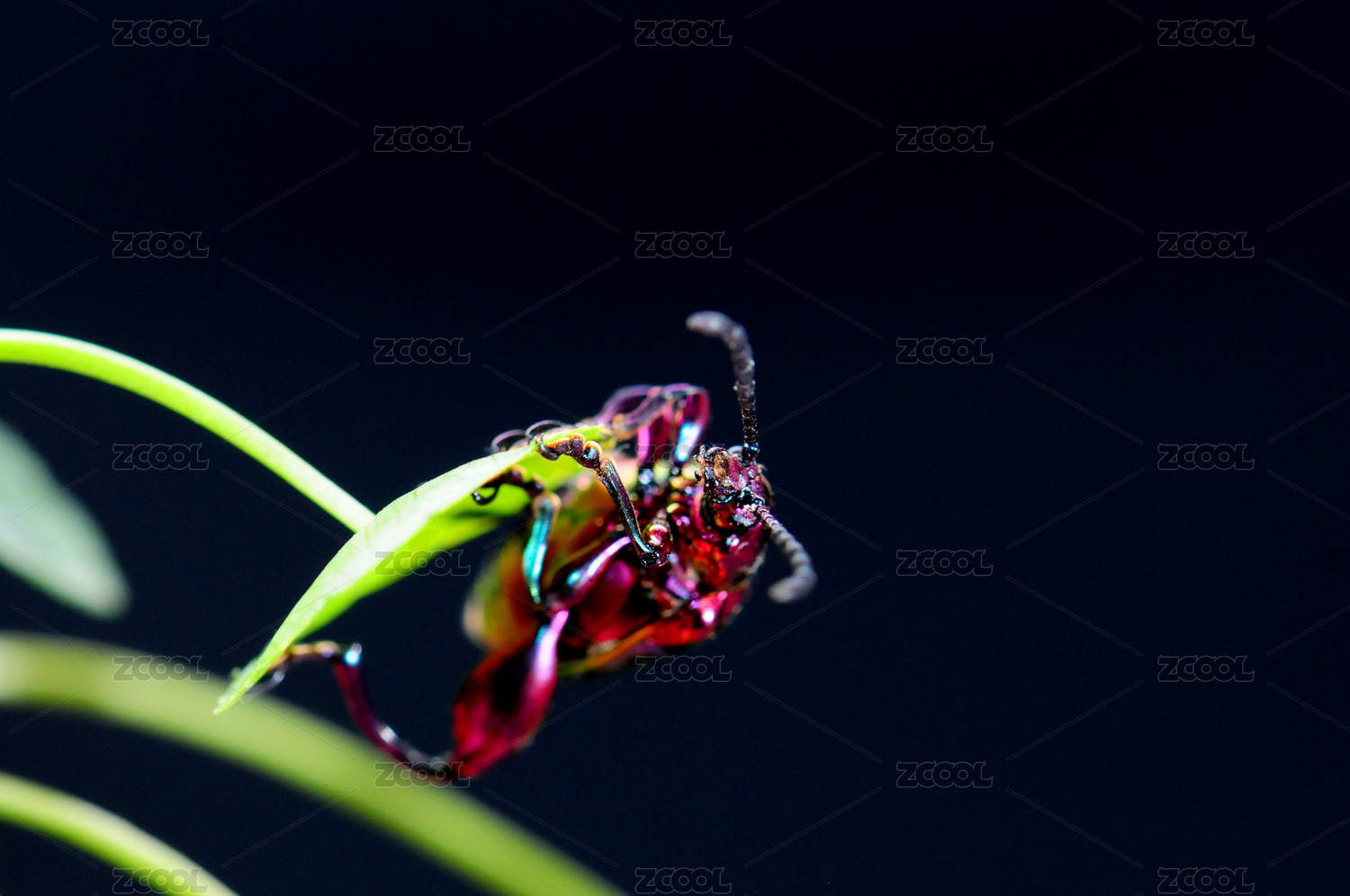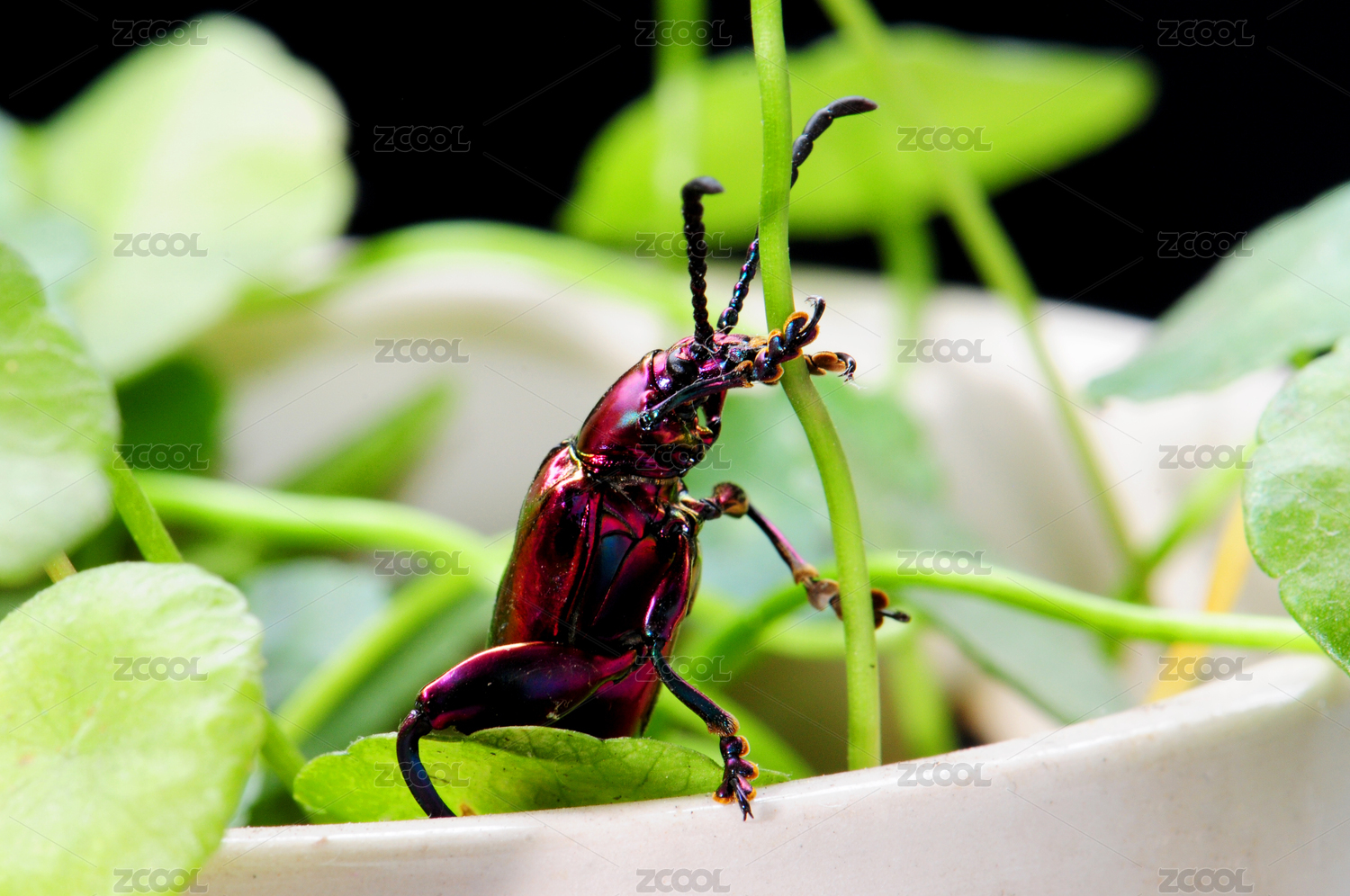 黑色背景下的一只紫色金甲蟲在銅錢草爬行