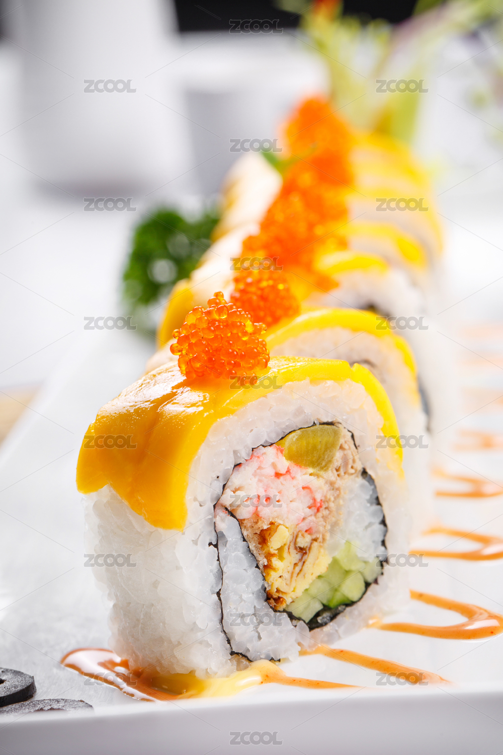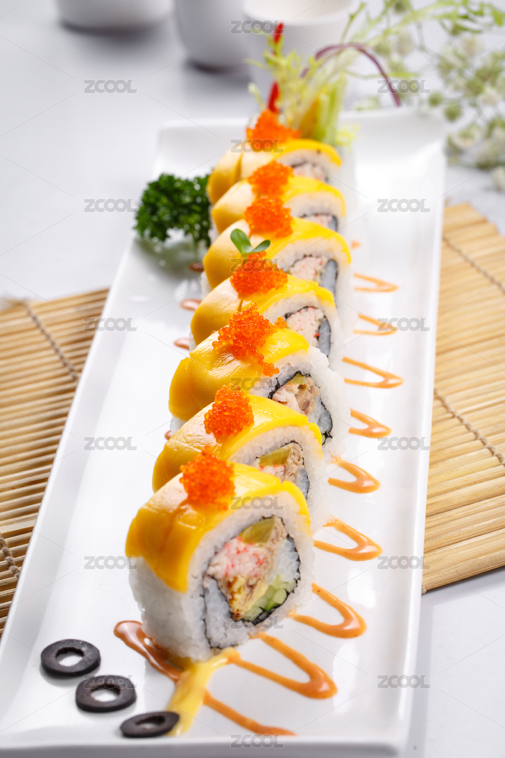 黃金甲蟹子壽司卷擺放在壽司簾上