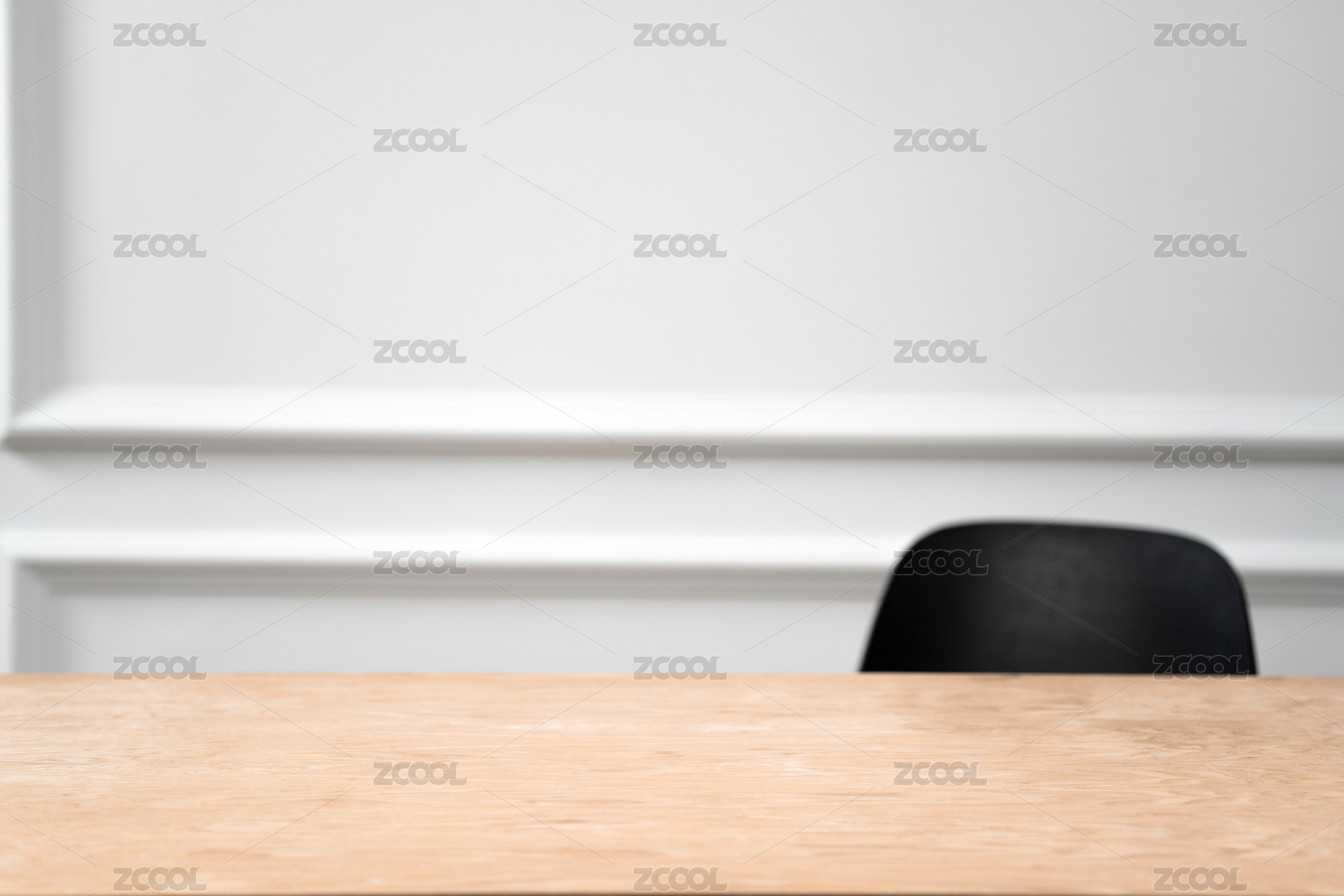黑色椅背前的空白木紋桌面,白色背景