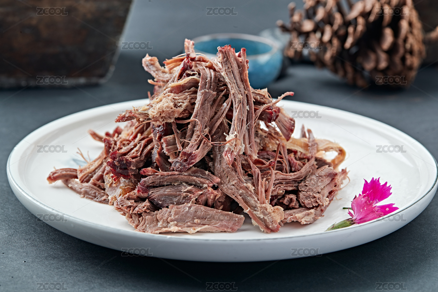 峨嵋手撕驢肉擺放在黑色鵝卵石上